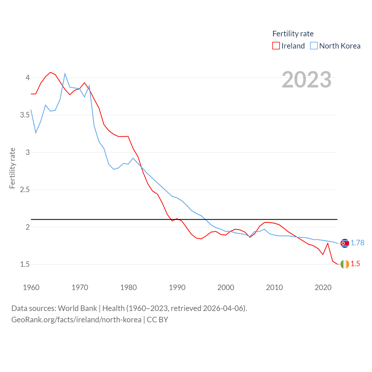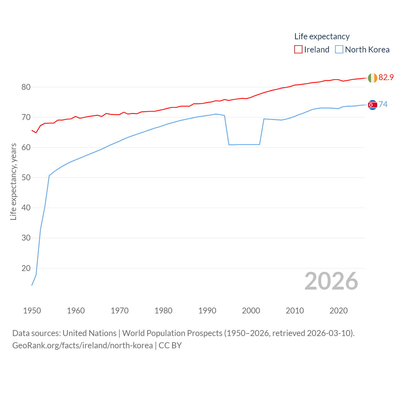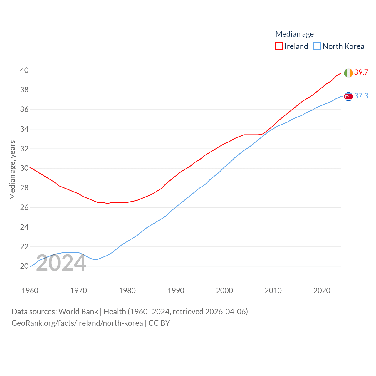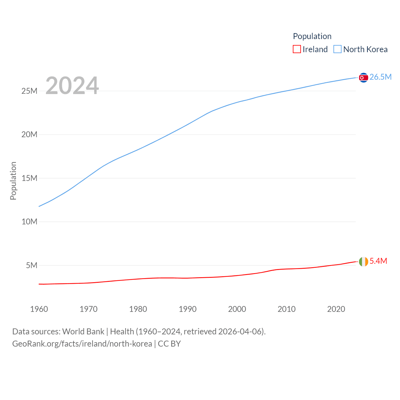 Ireland has a population of 5.4M (ranked 120/197), compared with 26.5M in North Korea (ranked 56/197). Ireland's land area is 26,599 sq mi versus 46,491 sq mi for North Korea (ranked 119th vs. 97th).