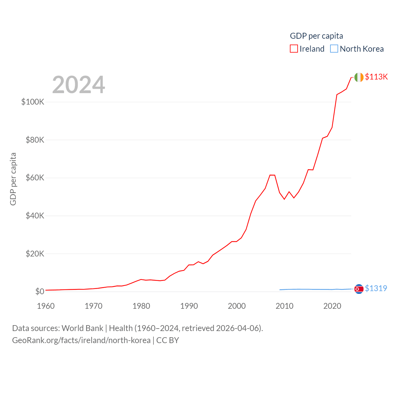 By GDP, Ireland ranks 25/197 ($609B) and North Korea ranks 106/197 ($34.9B). By GDP per capita, Ireland ranks 4/197 ($112,895), while North Korea ranks 168/197 ($1,319).
