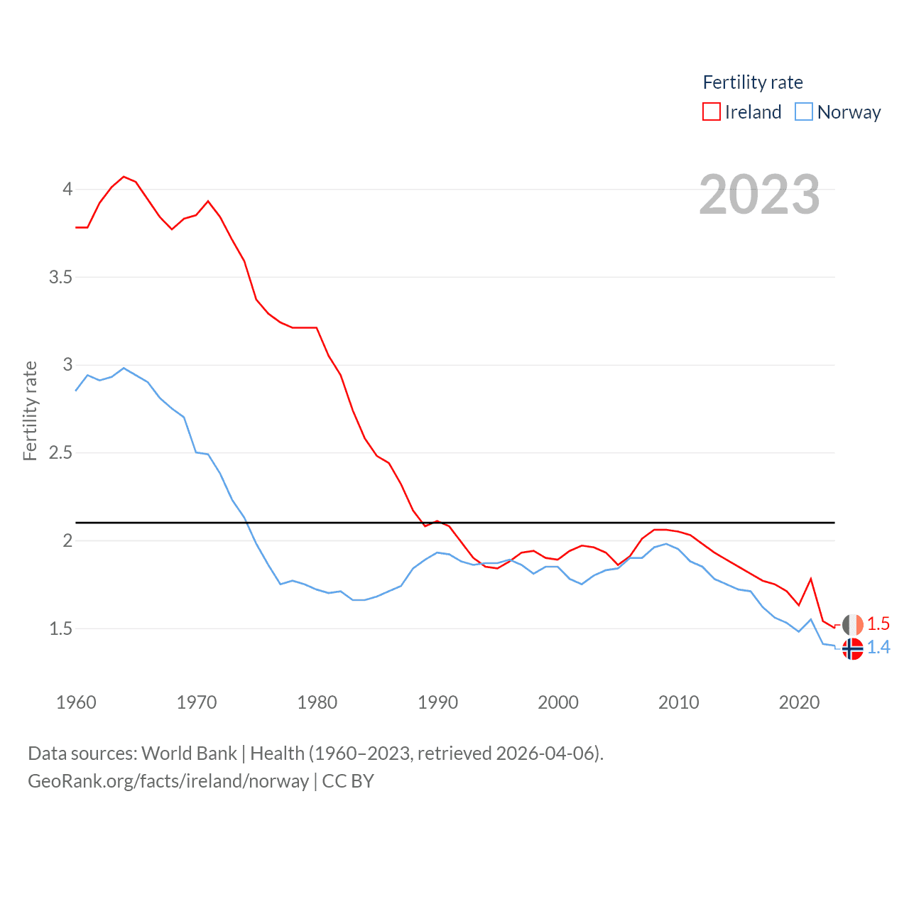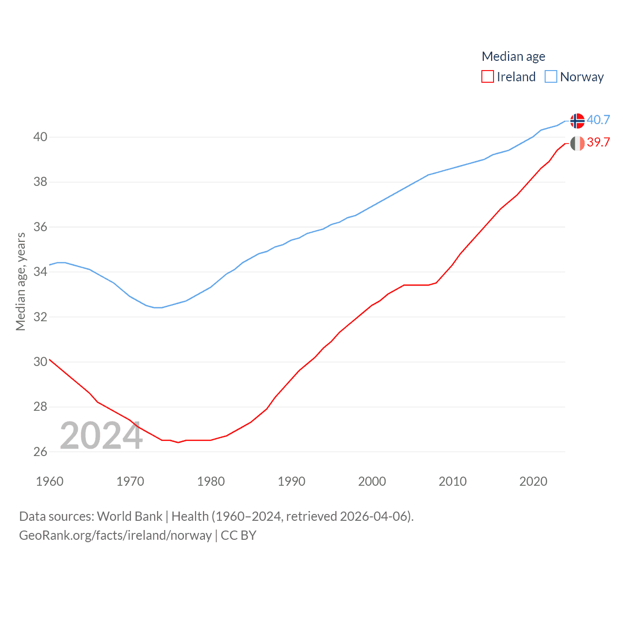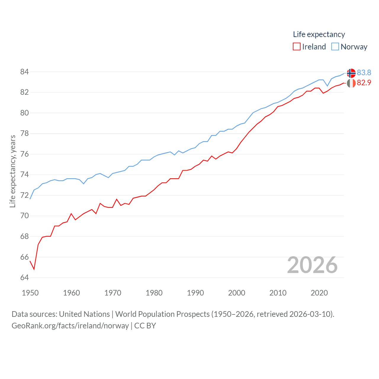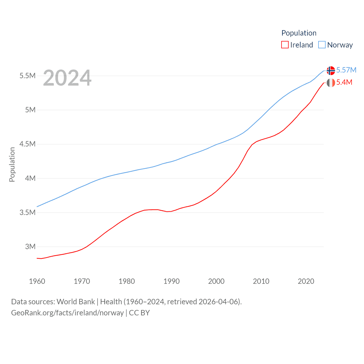 Ireland has a population of 5.4M (ranked 120/197), compared with 5.57M in Norway (ranked 118/197). Ireland's land area is 26,599 sq mi versus 140,645 sq mi for Norway (ranked 119th vs. 62nd).