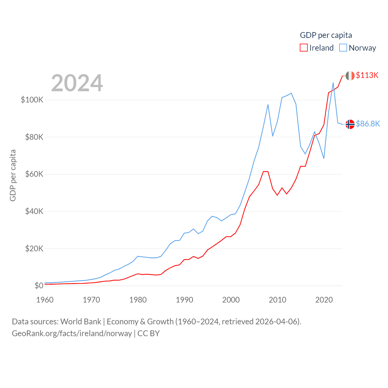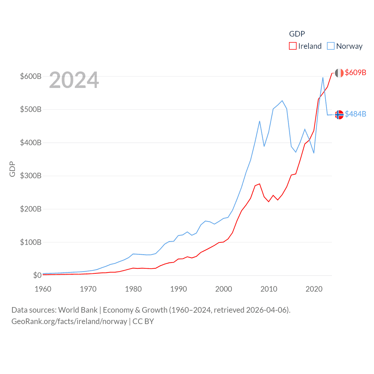 By GDP, Ireland ranks 25/197 ($609B) and Norway ranks 32/197 ($484B). By GDP per capita, Ireland ranks 4/197 ($112,895), while Norway ranks 8/197 ($86,785).