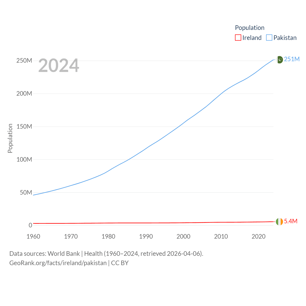 Ireland has a population of 5.4M (ranked 120/197), compared with 251M in Pakistan (ranked 5/197). Ireland's land area is 26,599 sq mi versus 297,638 sq mi for Pakistan (ranked 119th vs. 35th).