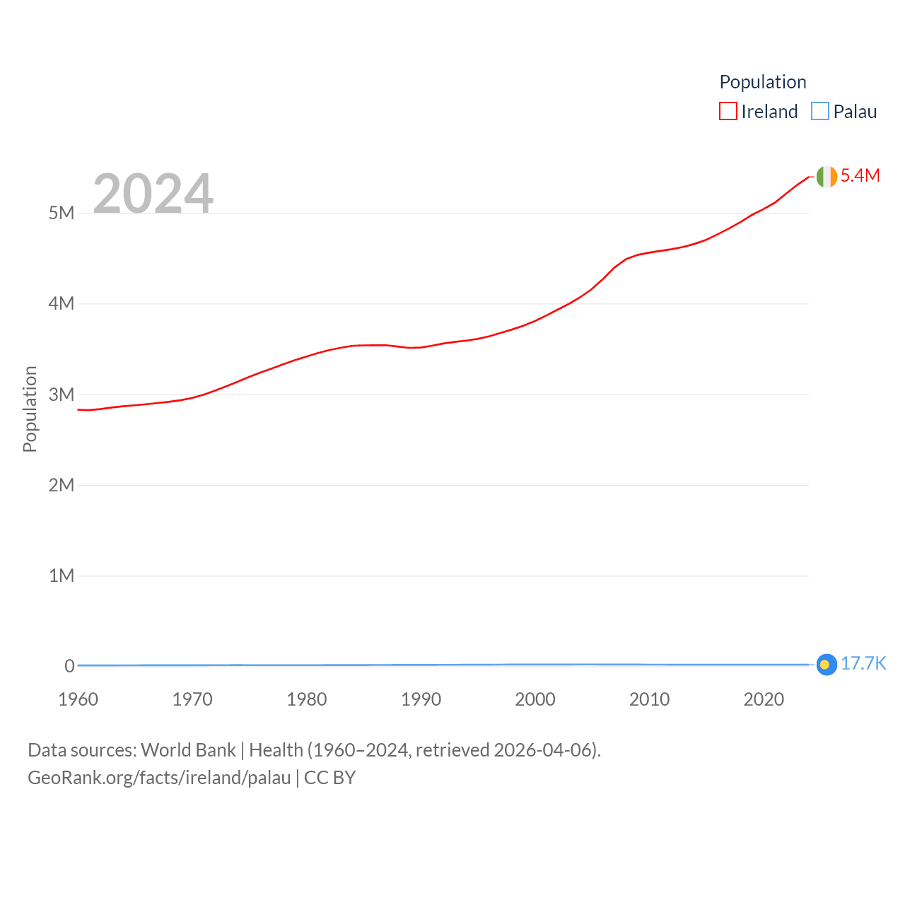 Ireland has a population of 5.4M (ranked 120/197), compared with 17.7K in Palau (ranked 194/197). Ireland's land area is 26,599 sq mi versus 177.6 sq mi for Palau (ranked 119th vs. 180th).