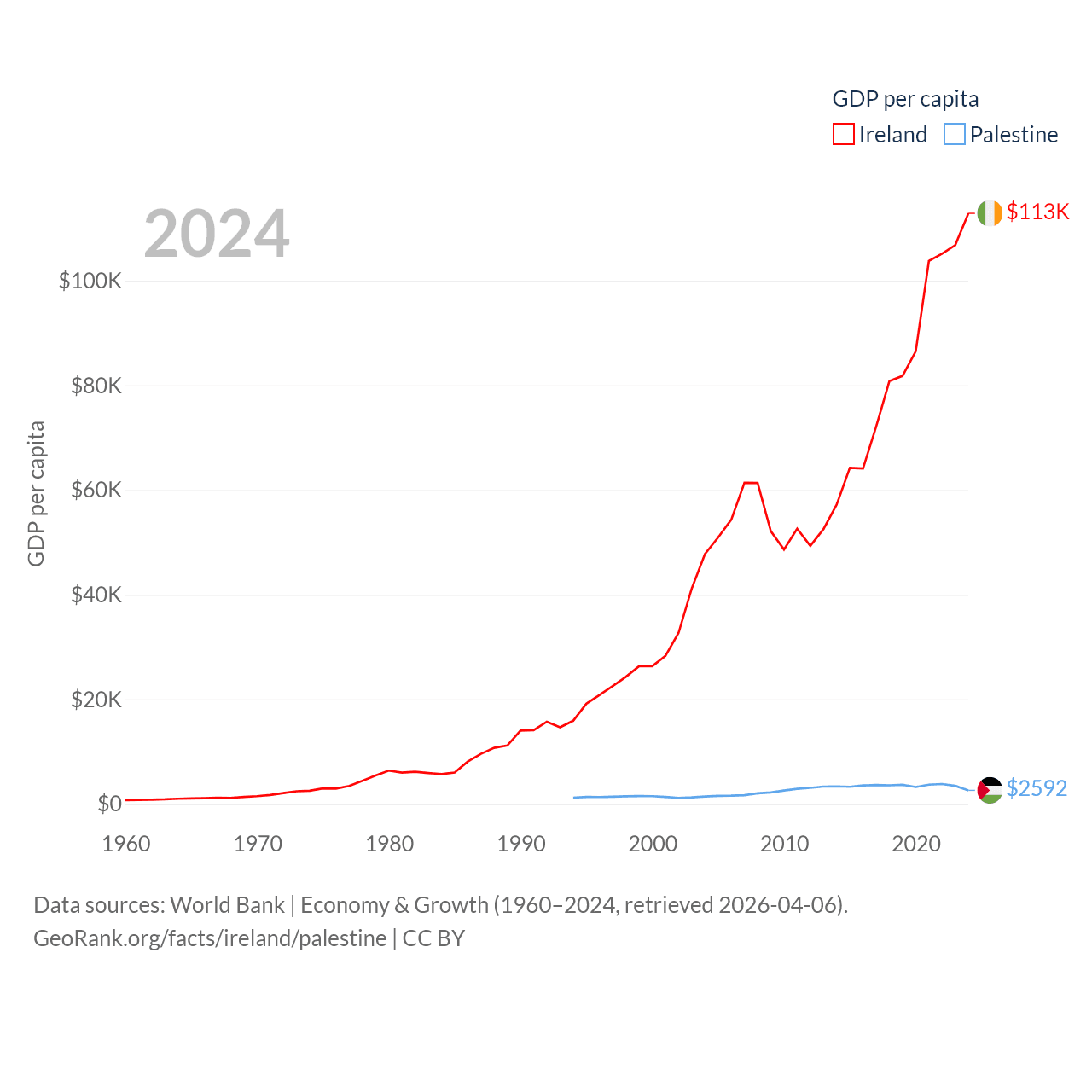 By GDP, Ireland ranks 25/197 ($609B) and Palestine ranks 146/197 ($13.7B). By GDP per capita, Ireland ranks 4/197 ($112,895), while Palestine ranks 147/197 ($2,592).