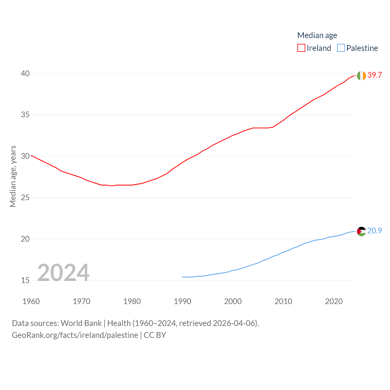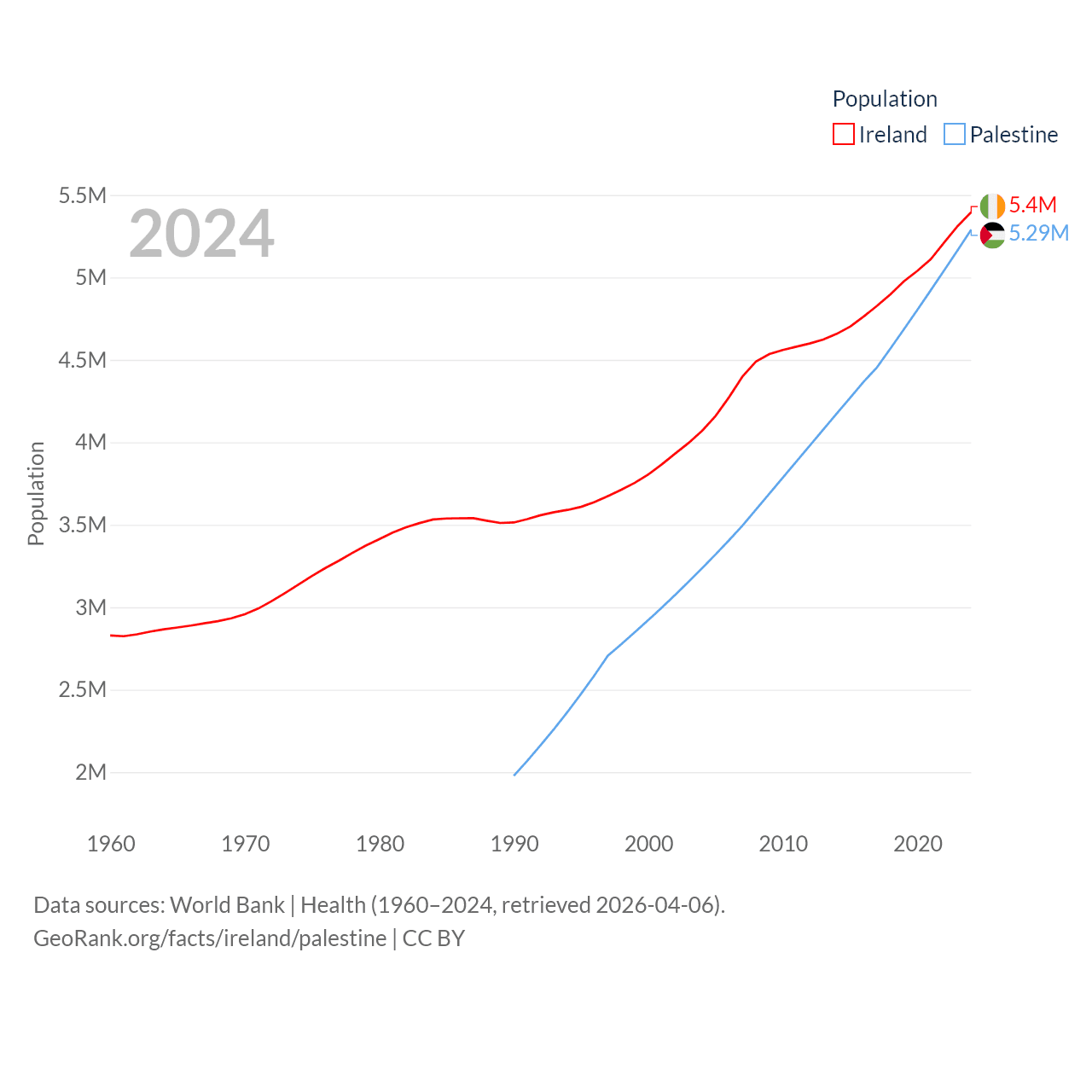 Ireland has a population of 5.4M (ranked 120/197), compared with 5.29M in Palestine (ranked 122/197). Ireland's land area is 26,599 sq mi versus 2,326 sq mi for Palestine (ranked 119th vs. 164th).