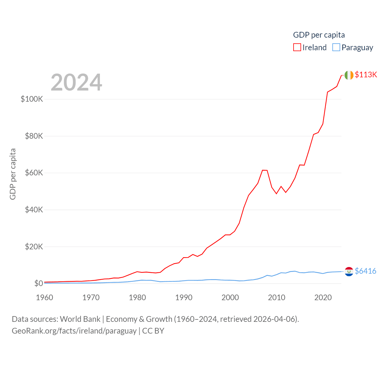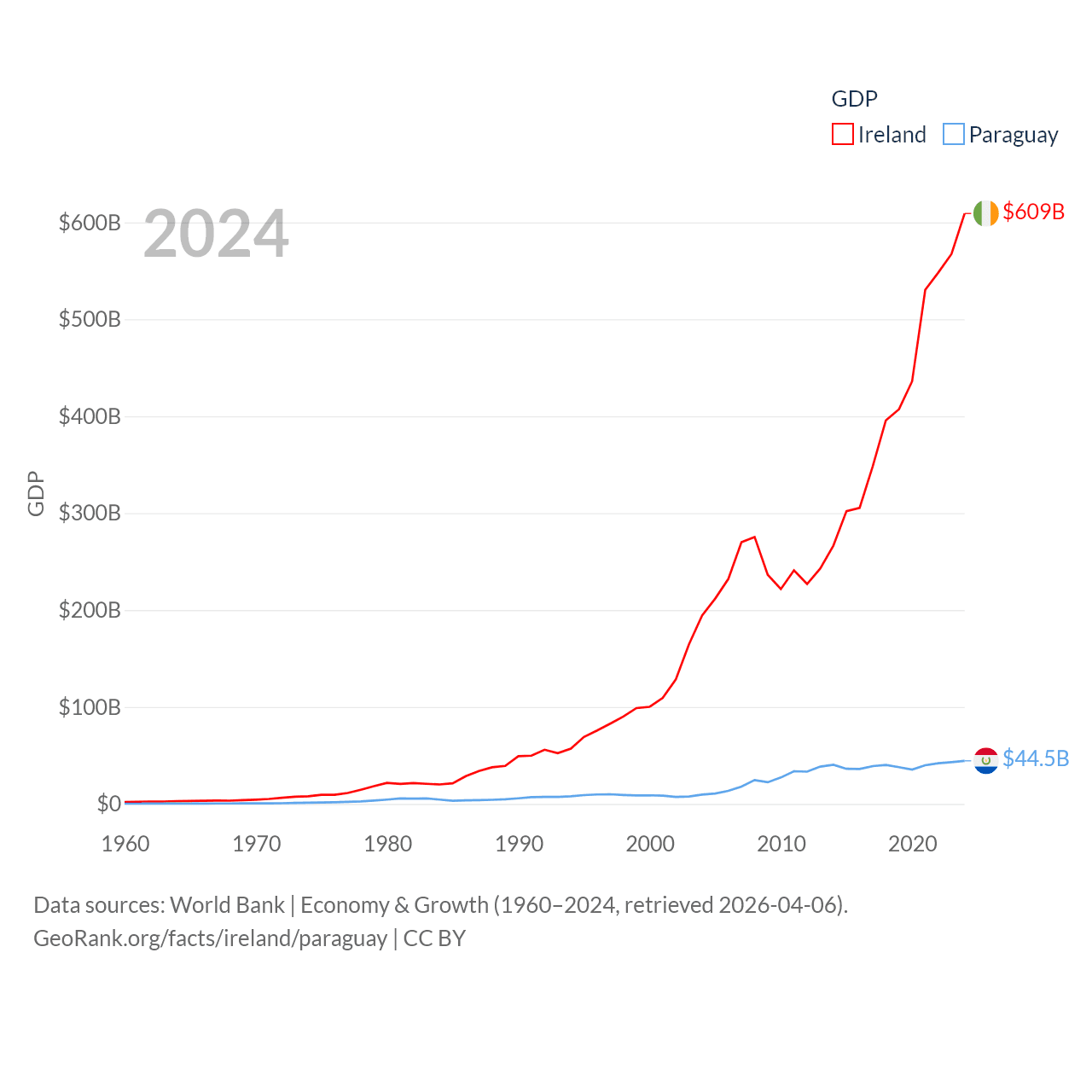 By GDP, Ireland ranks 25/197 ($609B) and Paraguay ranks 98/197 ($44.5B). By GDP per capita, Ireland ranks 4/197 ($112,895), while Paraguay ranks 109/197 ($6,416).