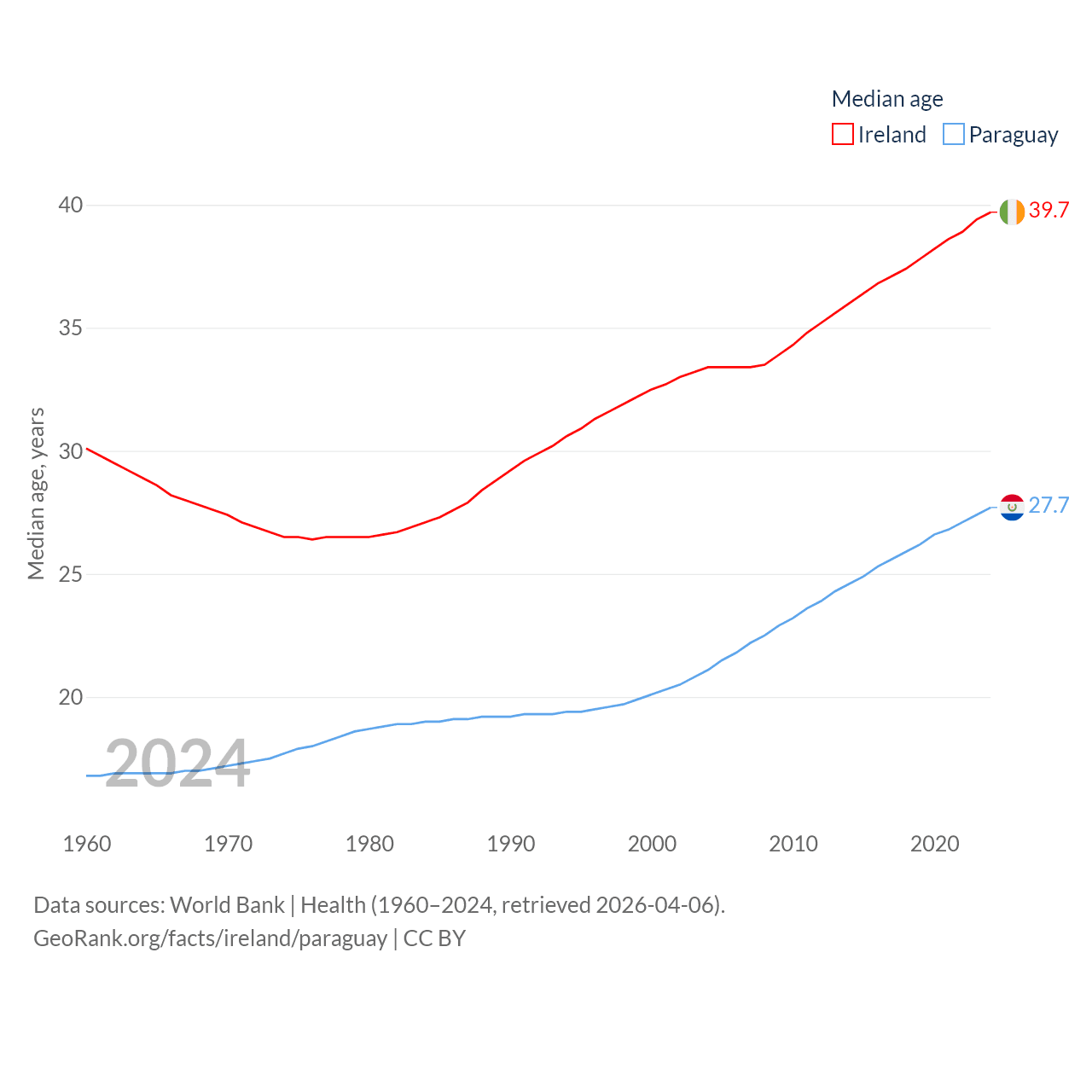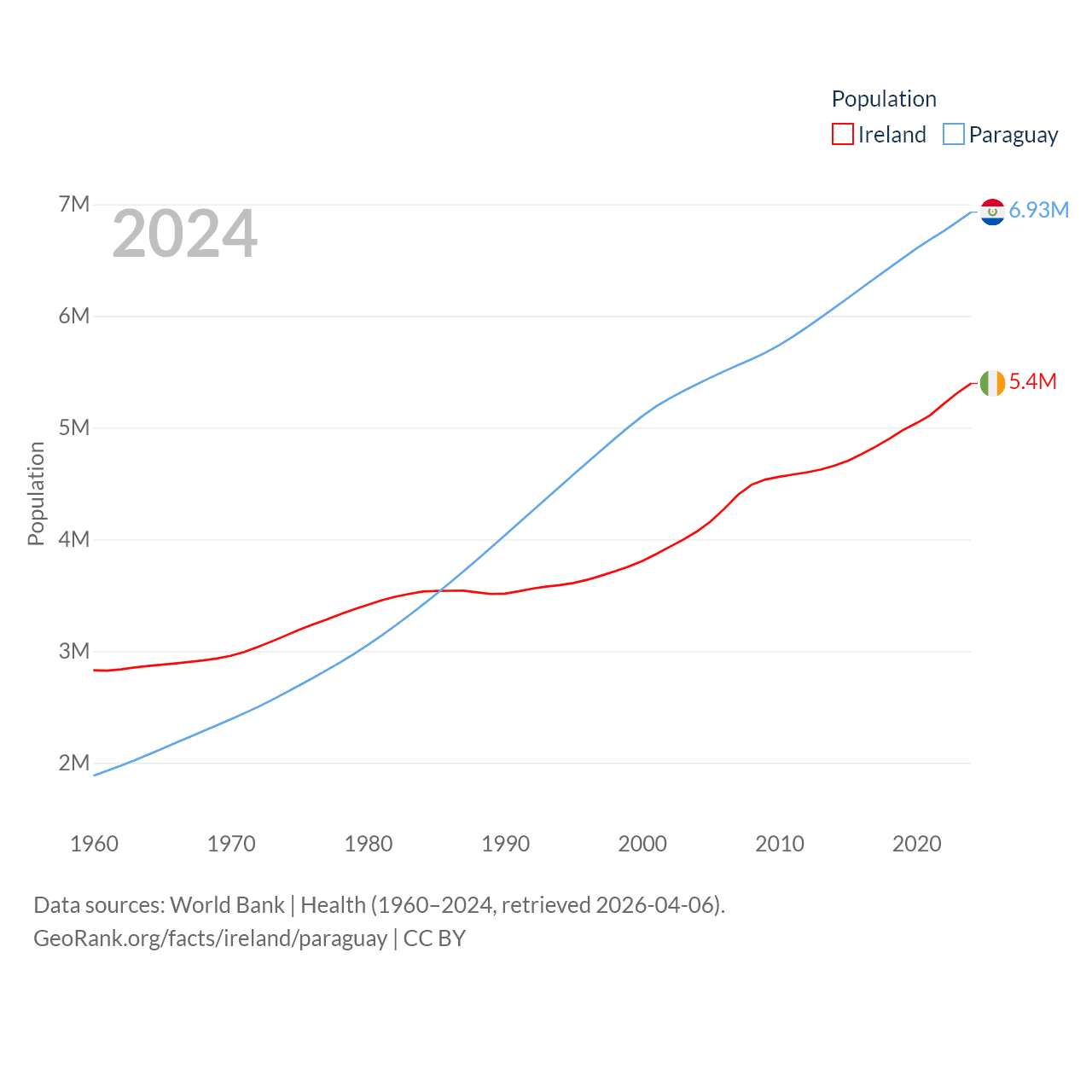 Ireland has a population of 5.4M (ranked 120/197), compared with 6.93M in Paraguay (ranked 107/197). Ireland's land area is 26,599 sq mi versus 152,901 sq mi for Paraguay (ranked 119th vs. 59th).