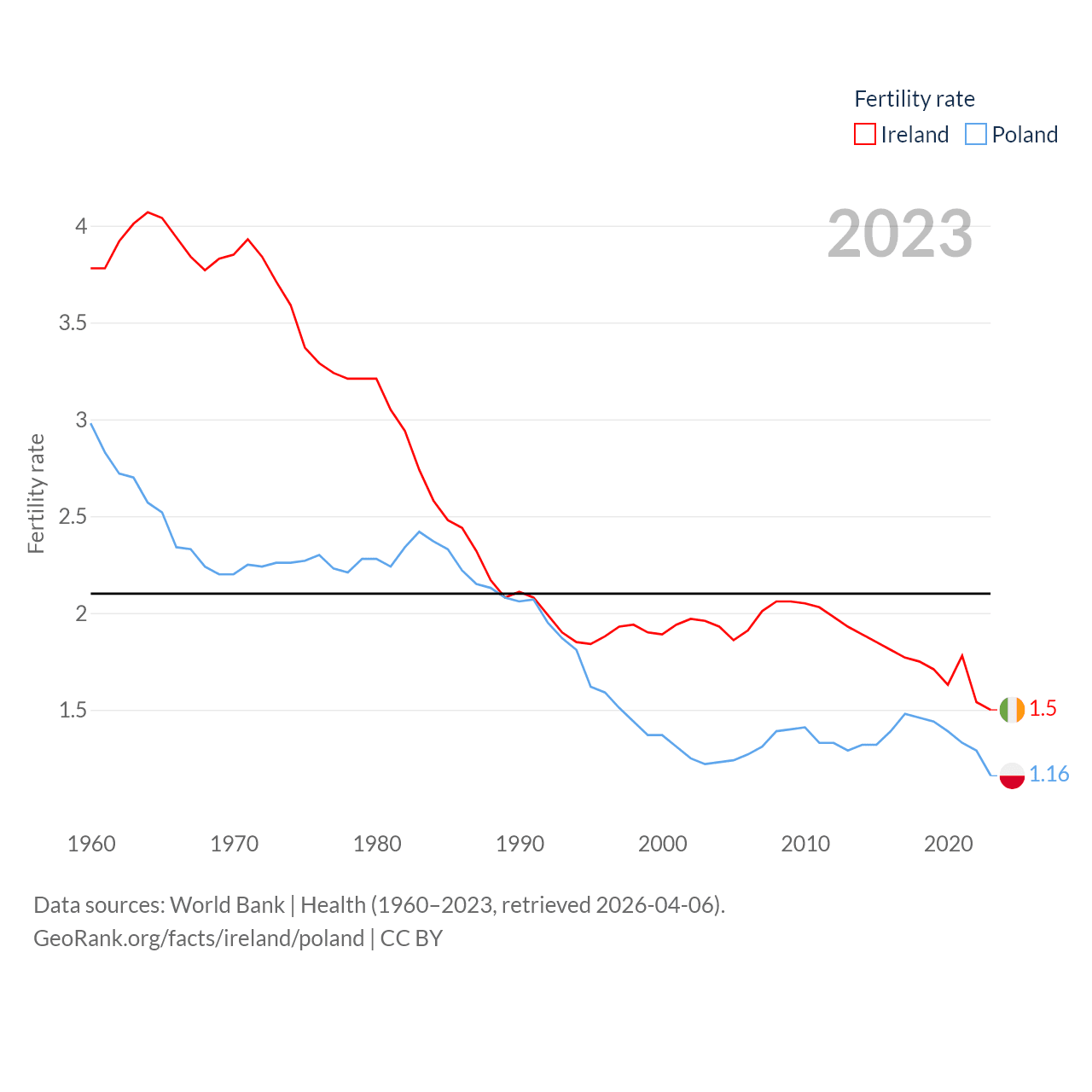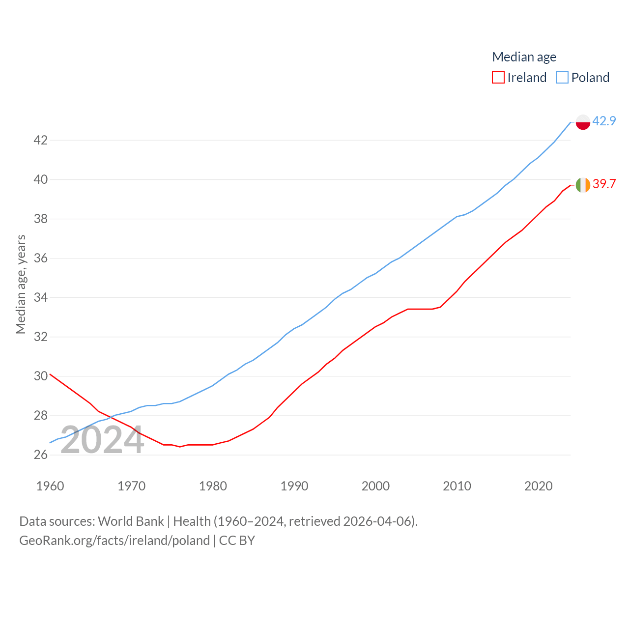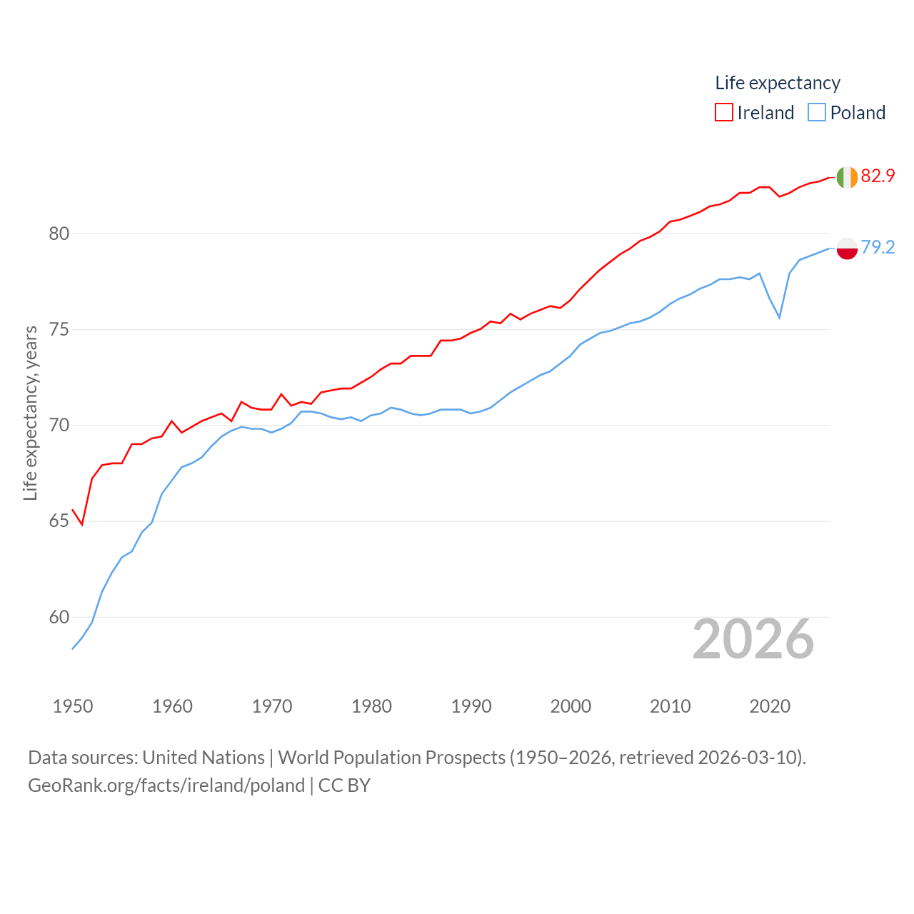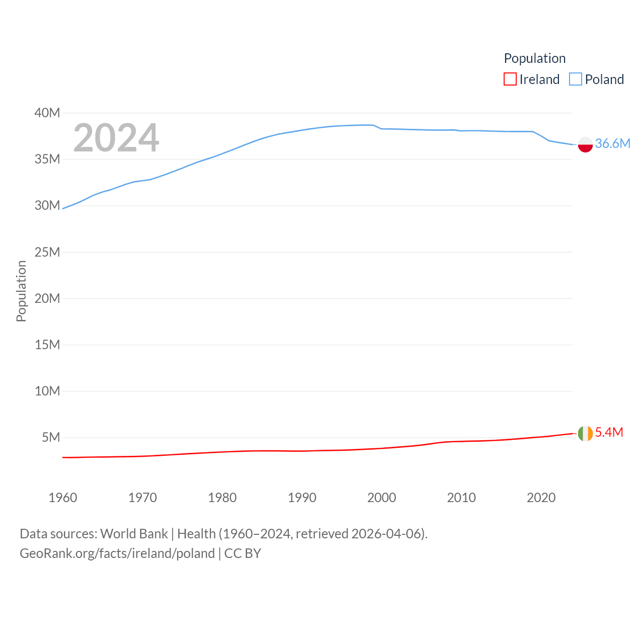 Ireland has a population of 5.4M (ranked 120/197), compared with 36.6M in Poland (ranked 42/197). Ireland's land area is 26,599 sq mi versus 118,252 sq mi for Poland (ranked 119th vs. 69th).