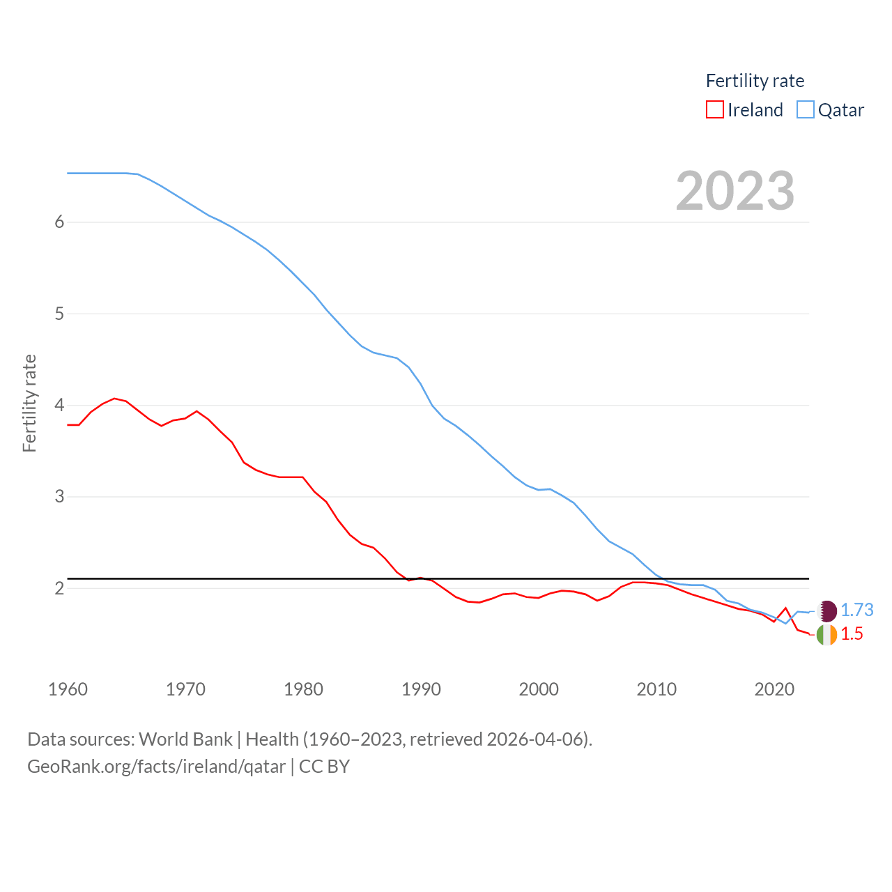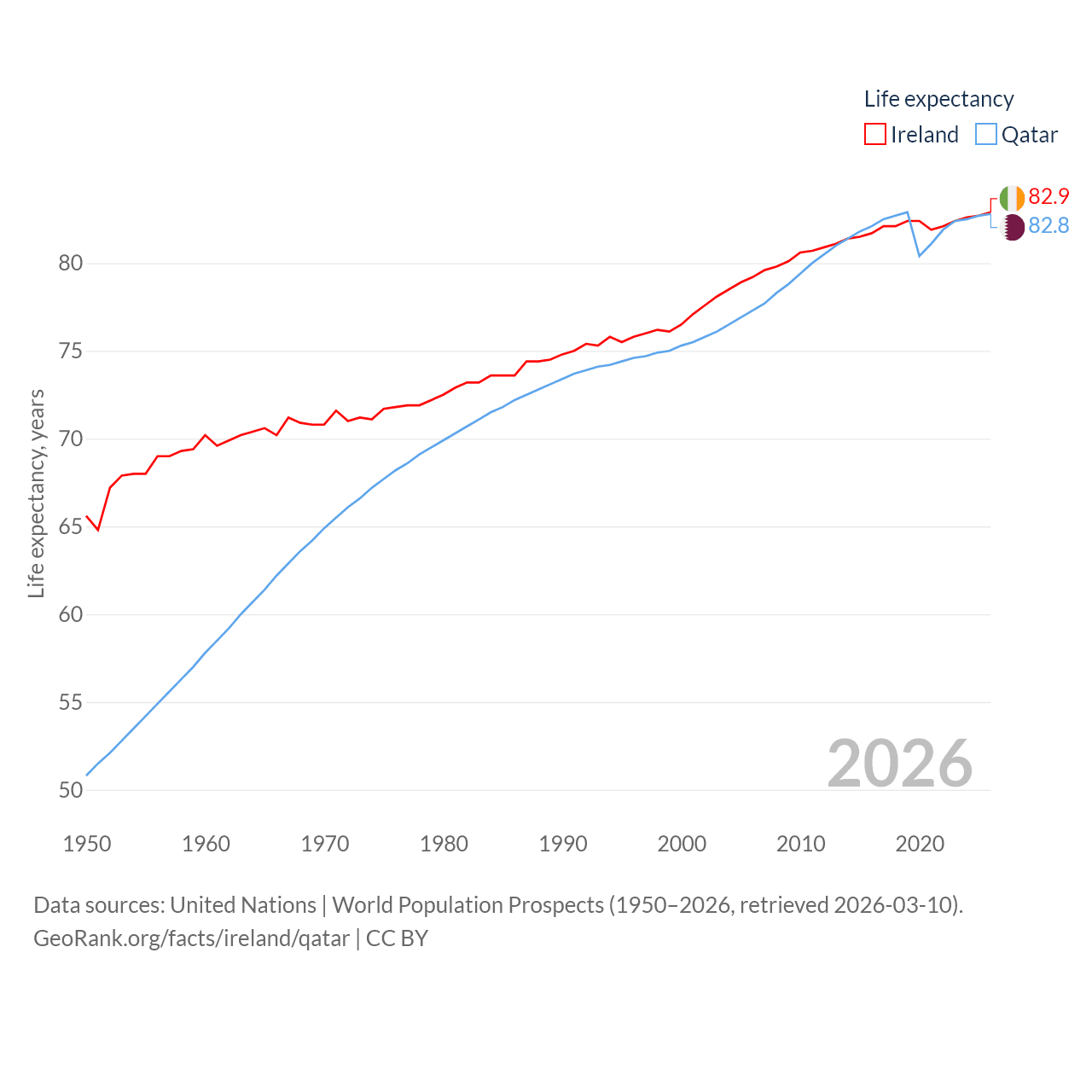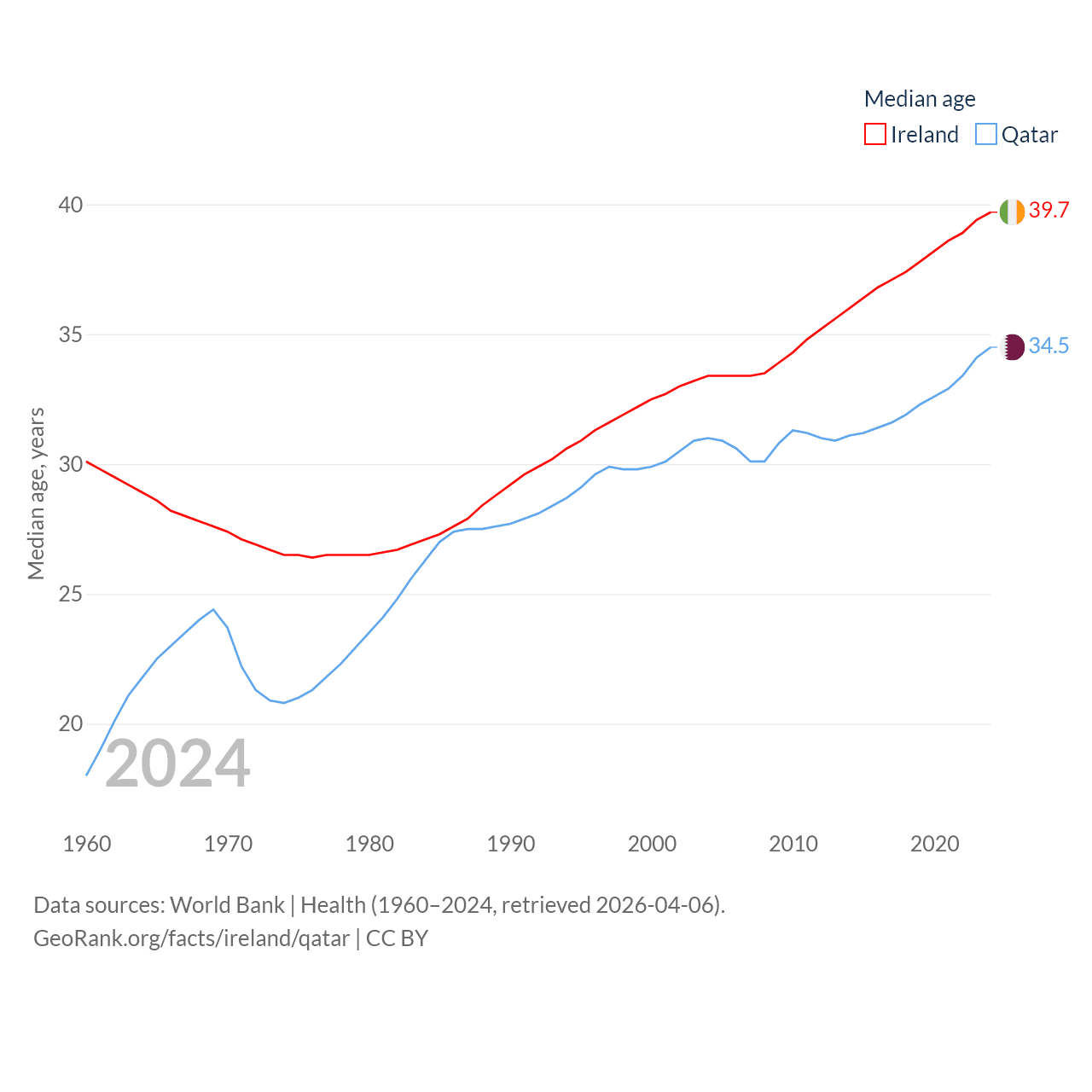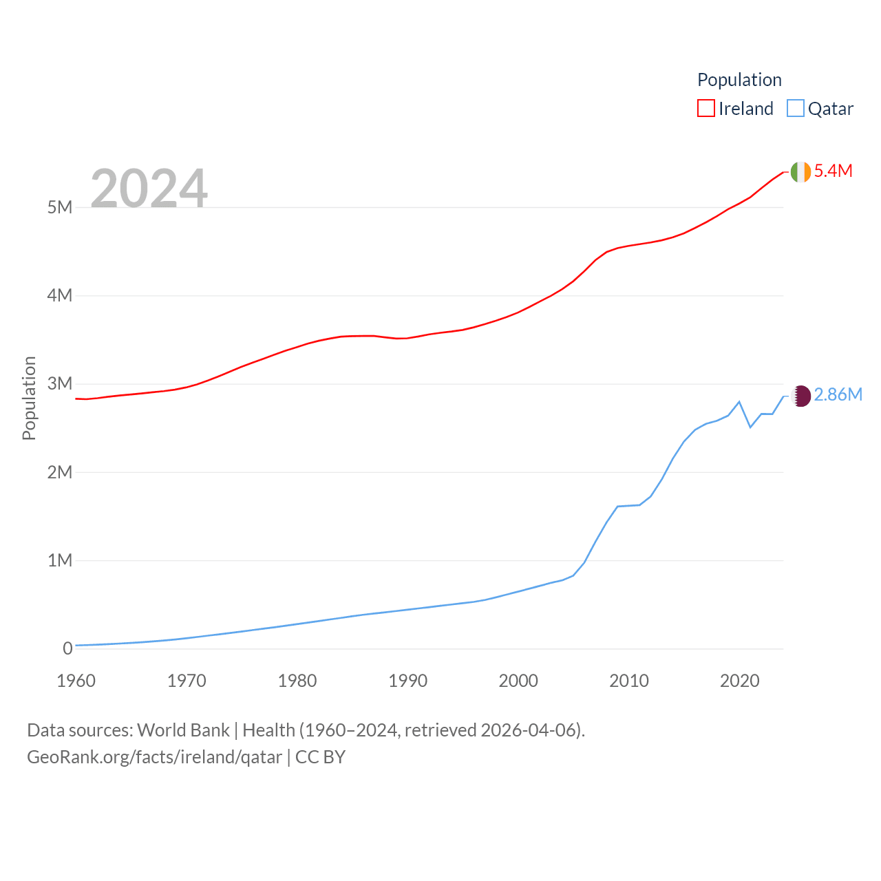 Ireland has a population of 5.4M (ranked 120/197), compared with 2.86M in Qatar (ranked 138/197). Ireland's land area is 26,599 sq mi versus 4,436 sq mi for Qatar (ranked 119th vs. 158th).