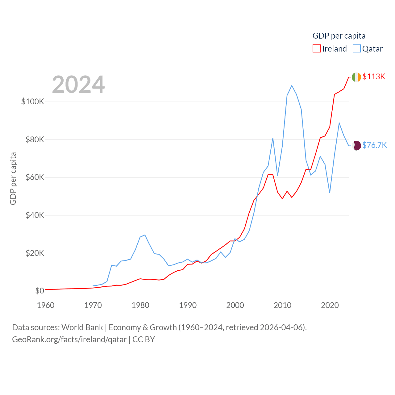By GDP, Ireland ranks 25/197 ($609B) and Qatar ranks 56/197 ($219B). By GDP per capita, Ireland ranks 4/197 ($112,895), while Qatar ranks 11/197 ($76,689).