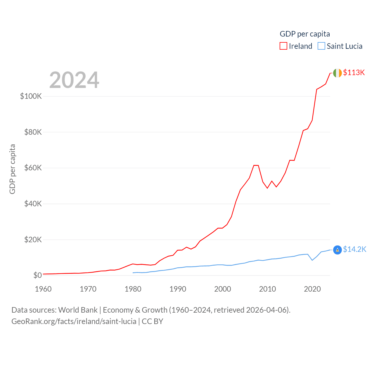 By GDP, Ireland ranks 25/197 ($609B) and Saint Lucia ranks 173/197 ($2.55B). By GDP per capita, Ireland ranks 4/197 ($112,895), while Saint Lucia ranks 70/197 ($14,182).