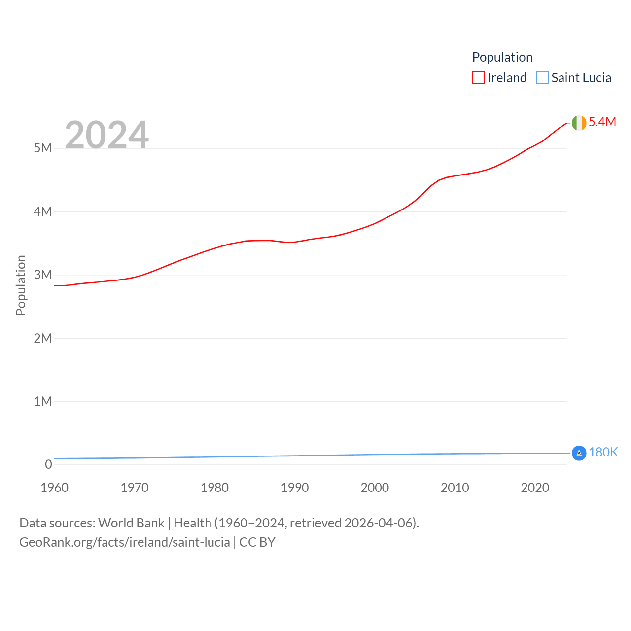 Ireland has a population of 5.4M (ranked 120/197), compared with 180K in Saint Lucia (ranked 178/197). Ireland's land area is 26,599 sq mi versus 235.5 sq mi for Saint Lucia (ranked 119th vs. 178th).