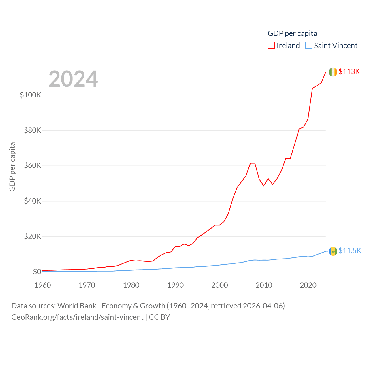 By GDP, Ireland ranks 25/197 ($609B) and Saint Vincent ranks 186/197 ($1.16B). By GDP per capita, Ireland ranks 4/197 ($112,895), while Saint Vincent ranks 81/197 ($11,501).