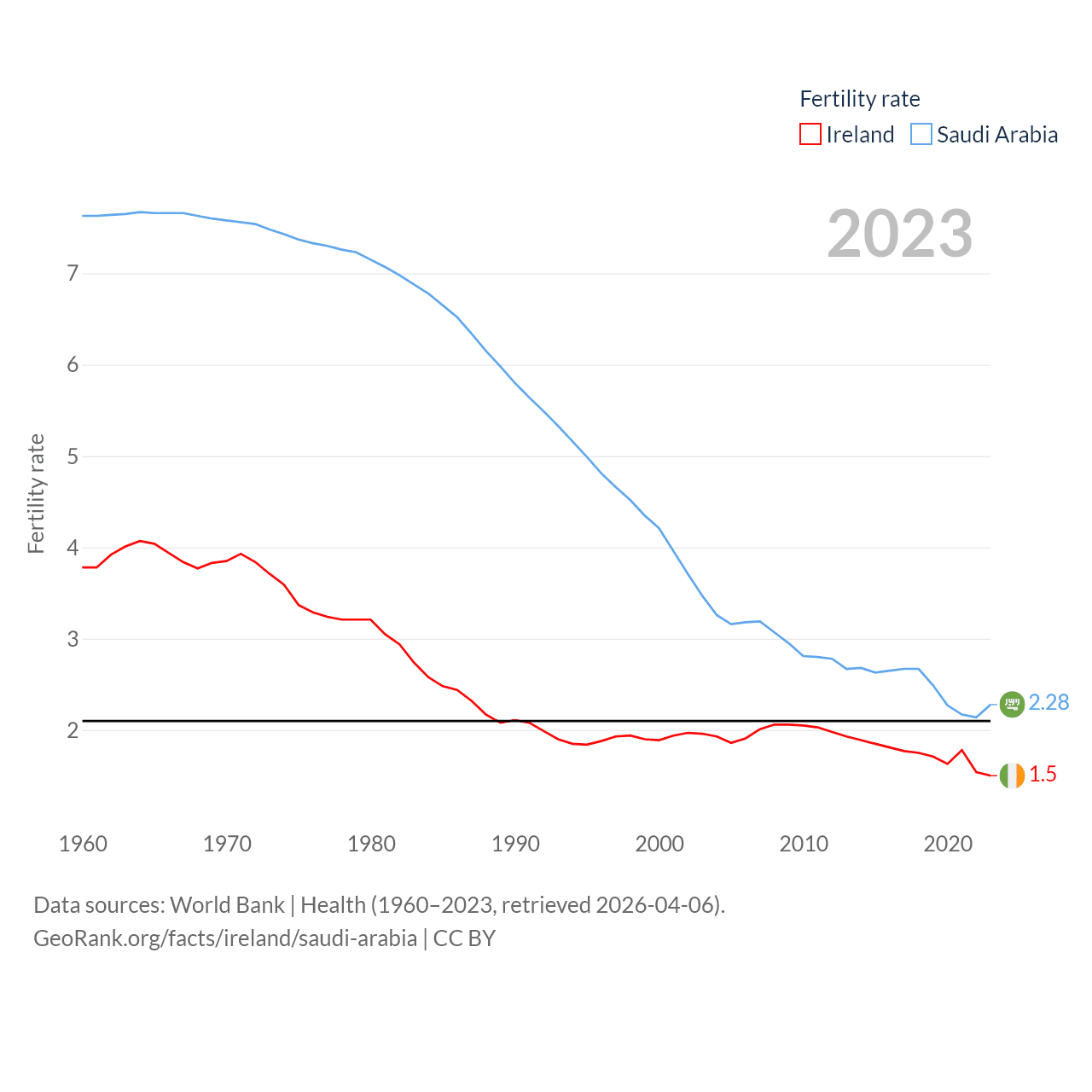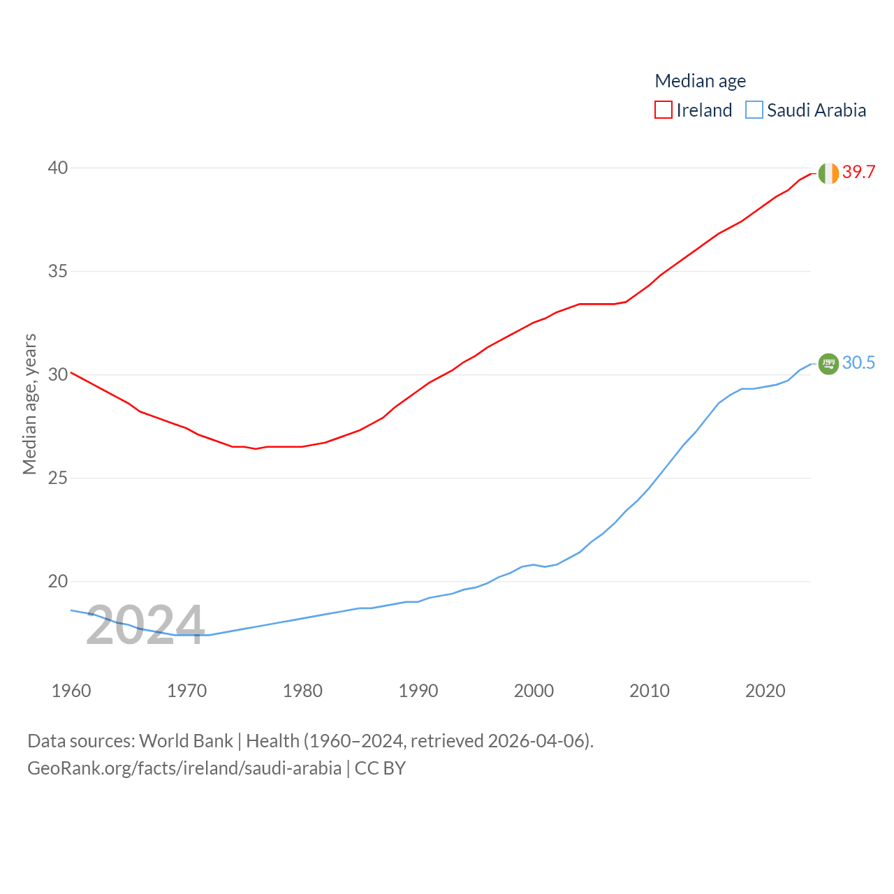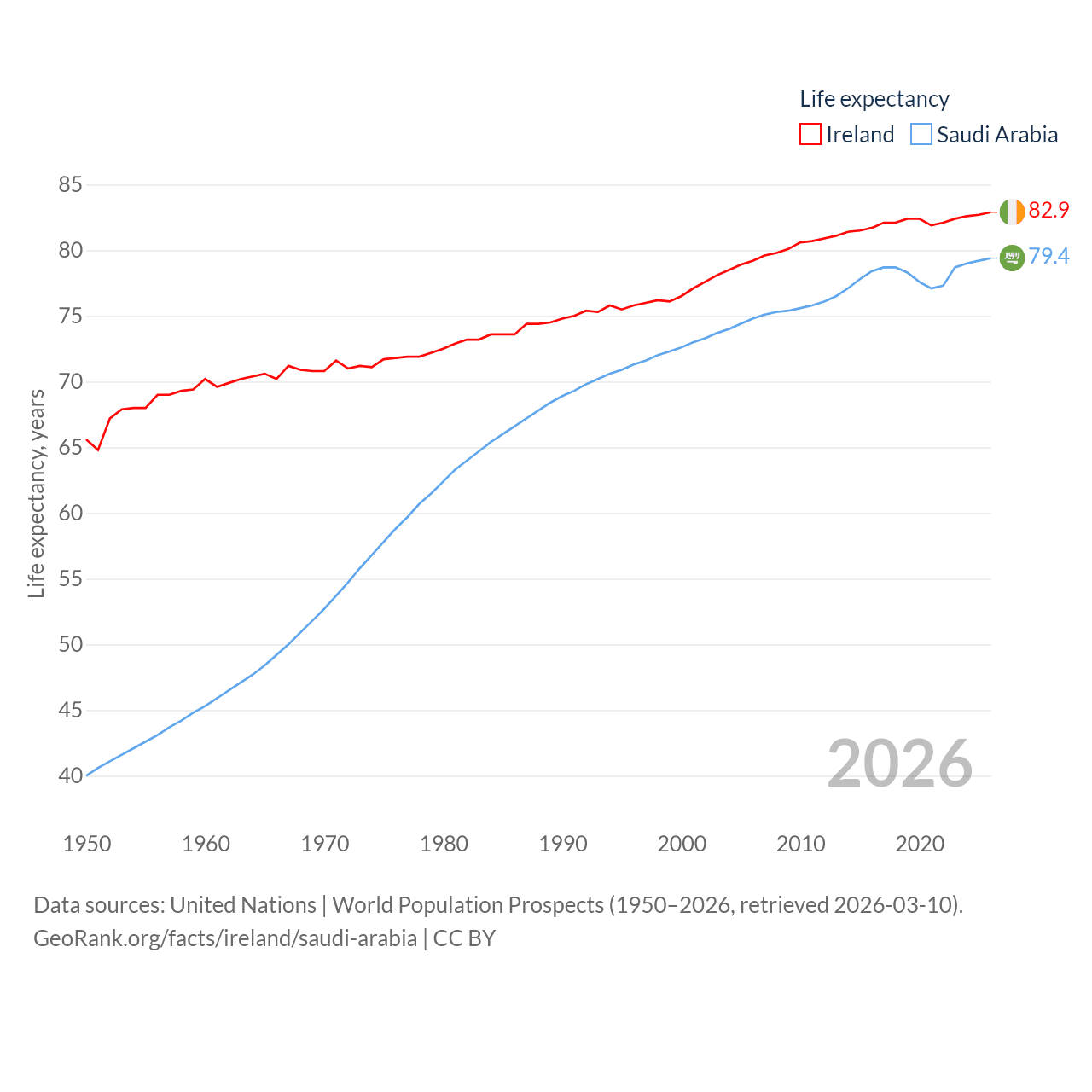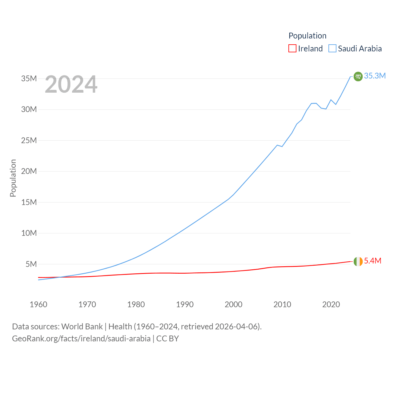 Ireland has a population of 5.4M (ranked 120/197), compared with 35.3M in Saudi Arabia (ranked 45/197). Ireland's land area is 26,599 sq mi versus 830,000 sq mi for Saudi Arabia (ranked 119th vs. 12th).