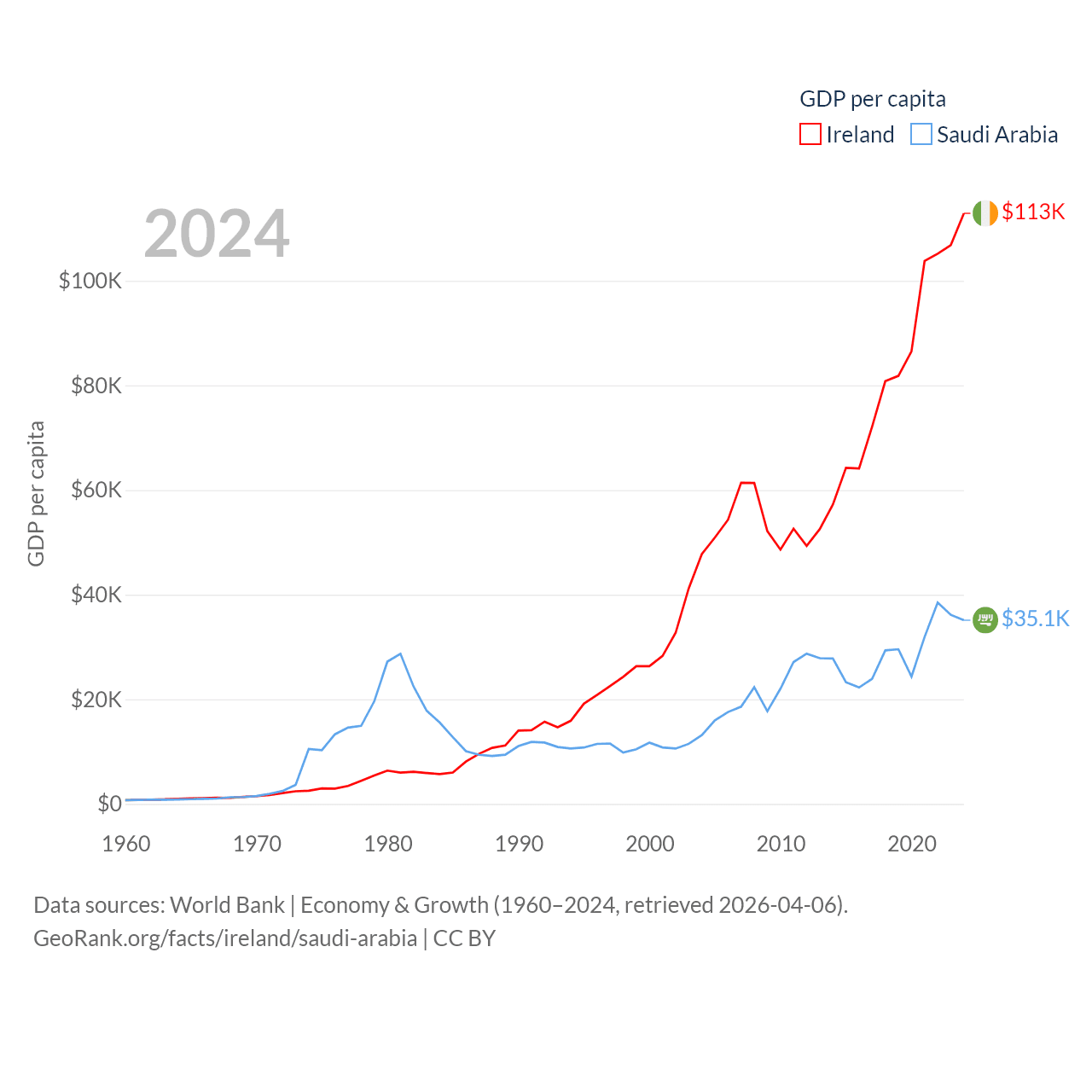 By GDP, Ireland ranks 25/197 ($609B) and Saudi Arabia ranks 18/197 ($1.24T). By GDP per capita, Ireland ranks 4/197 ($112,895), while Saudi Arabia ranks 33/197 ($35,122).
