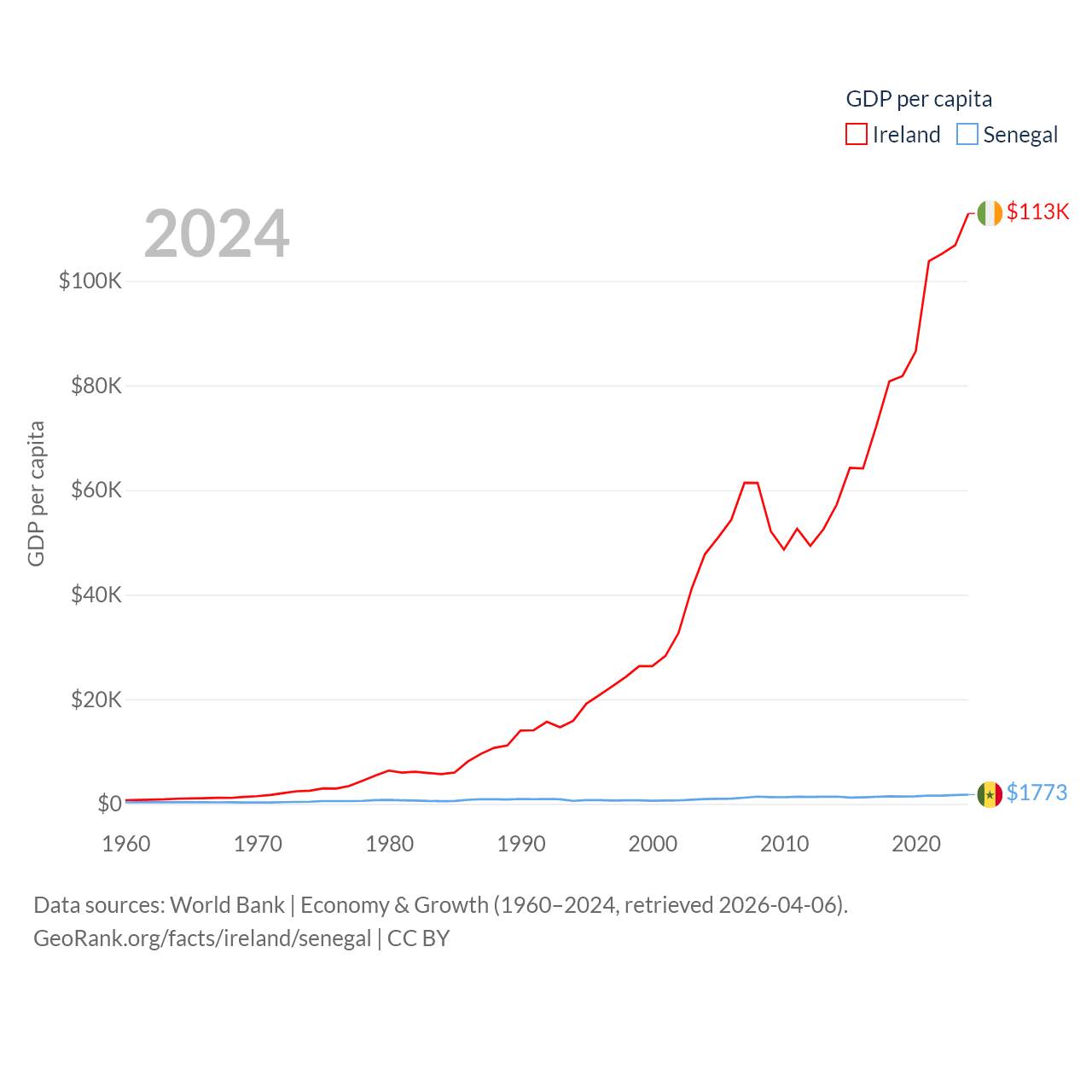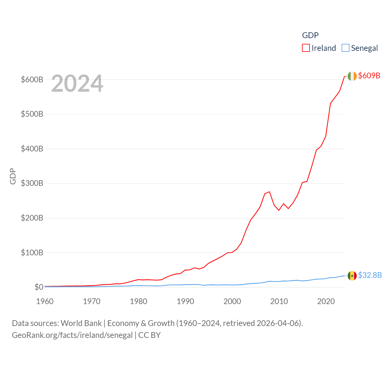 By GDP, Ireland ranks 25/197 ($609B) and Senegal ranks 109/197 ($32.8B). By GDP per capita, Ireland ranks 4/197 ($112,895), while Senegal ranks 159/197 ($1,773).