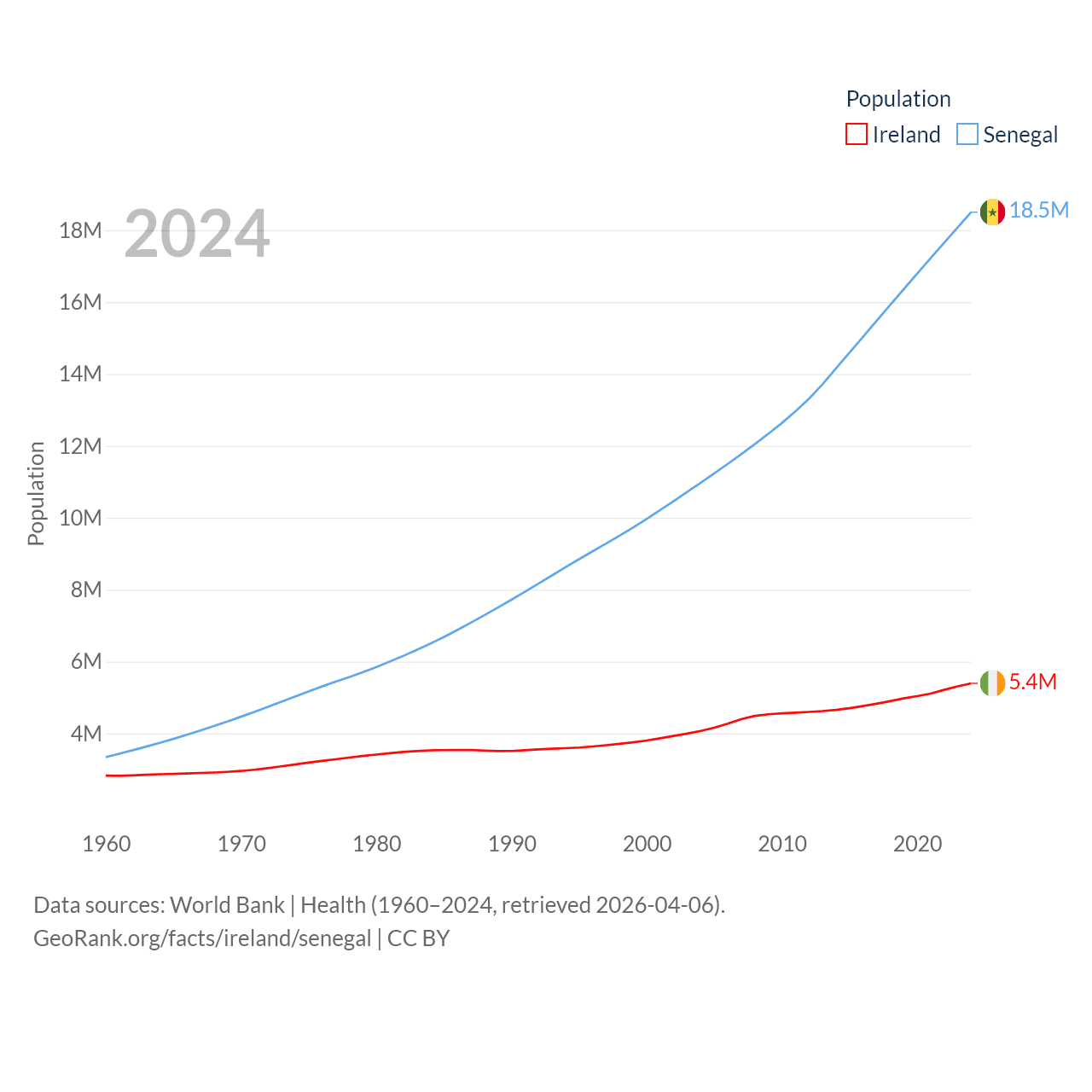 Ireland has a population of 5.4M (ranked 120/197), compared with 18.5M in Senegal (ranked 69/197). Ireland's land area is 26,599 sq mi versus 74,336 sq mi for Senegal (ranked 119th vs. 85th).