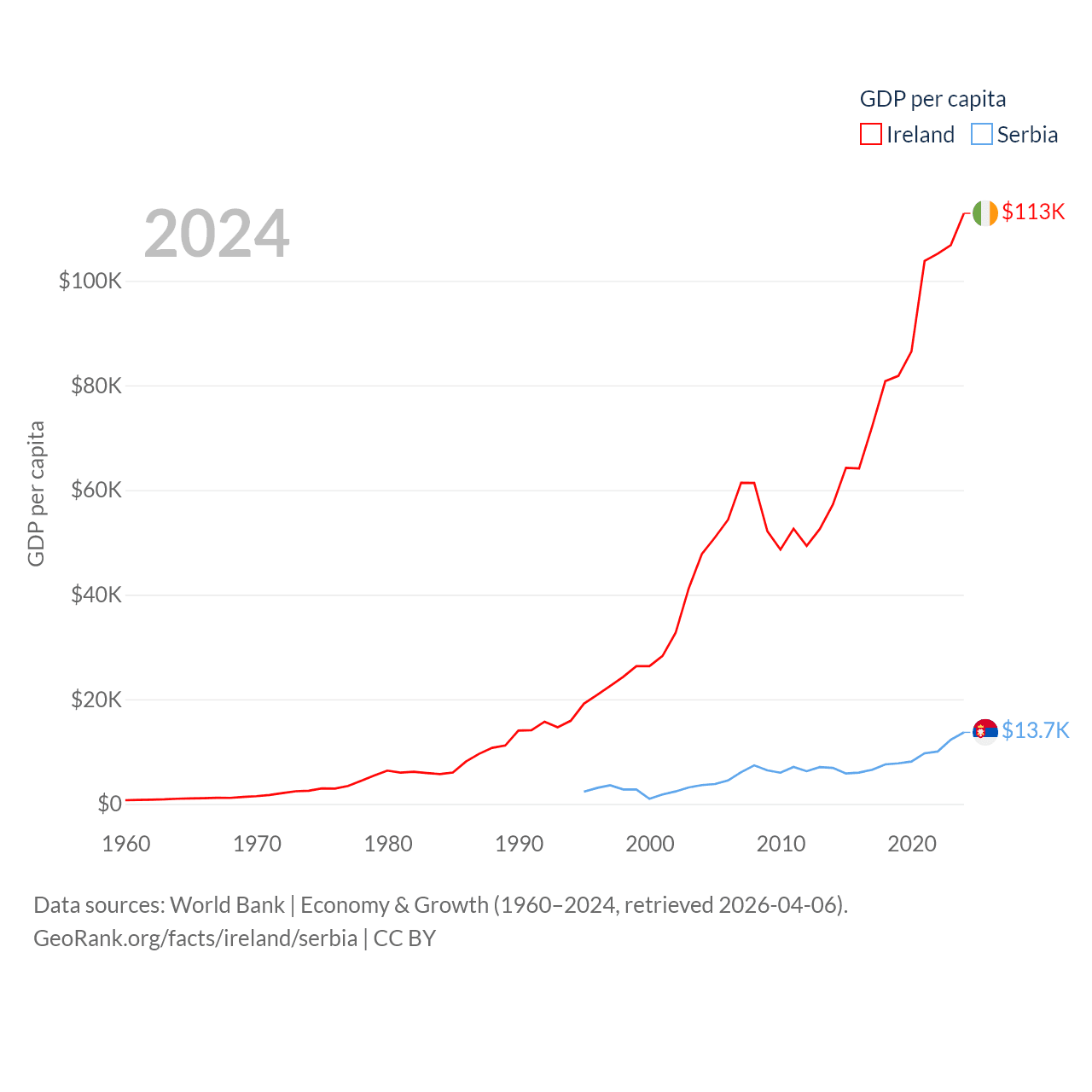 By GDP, Ireland ranks 25/197 ($609B) and Serbia ranks 76/197 ($90.1B). By GDP per capita, Ireland ranks 4/197 ($112,895), while Serbia ranks 73/197 ($13,679).
