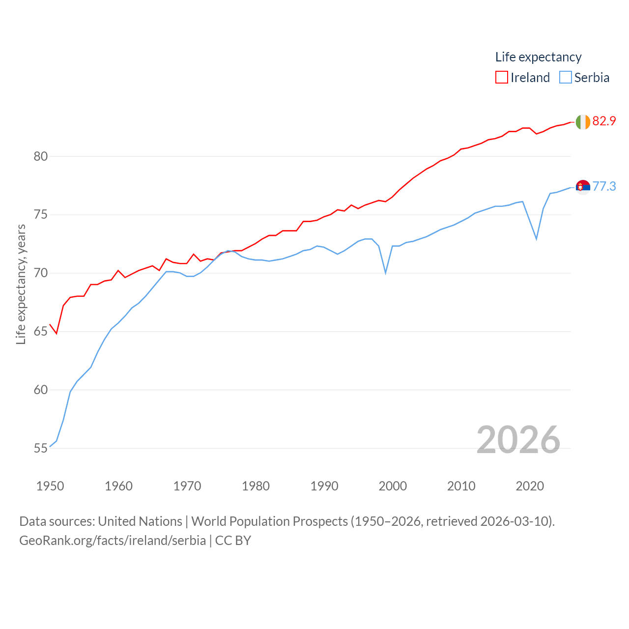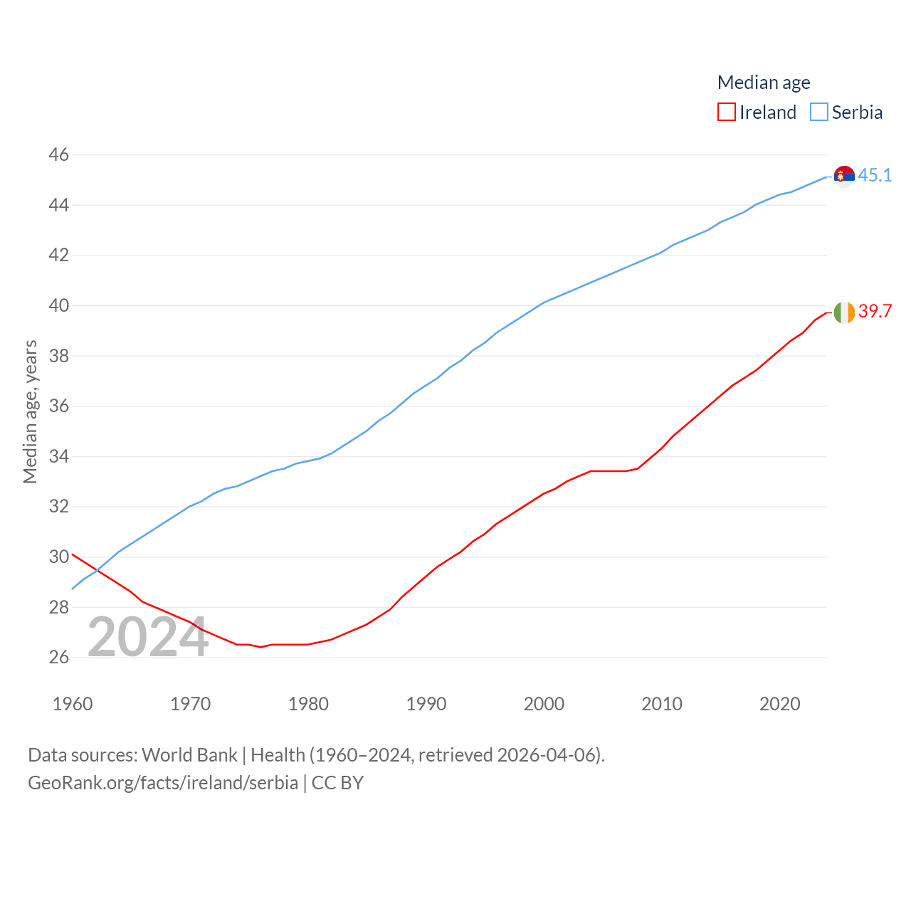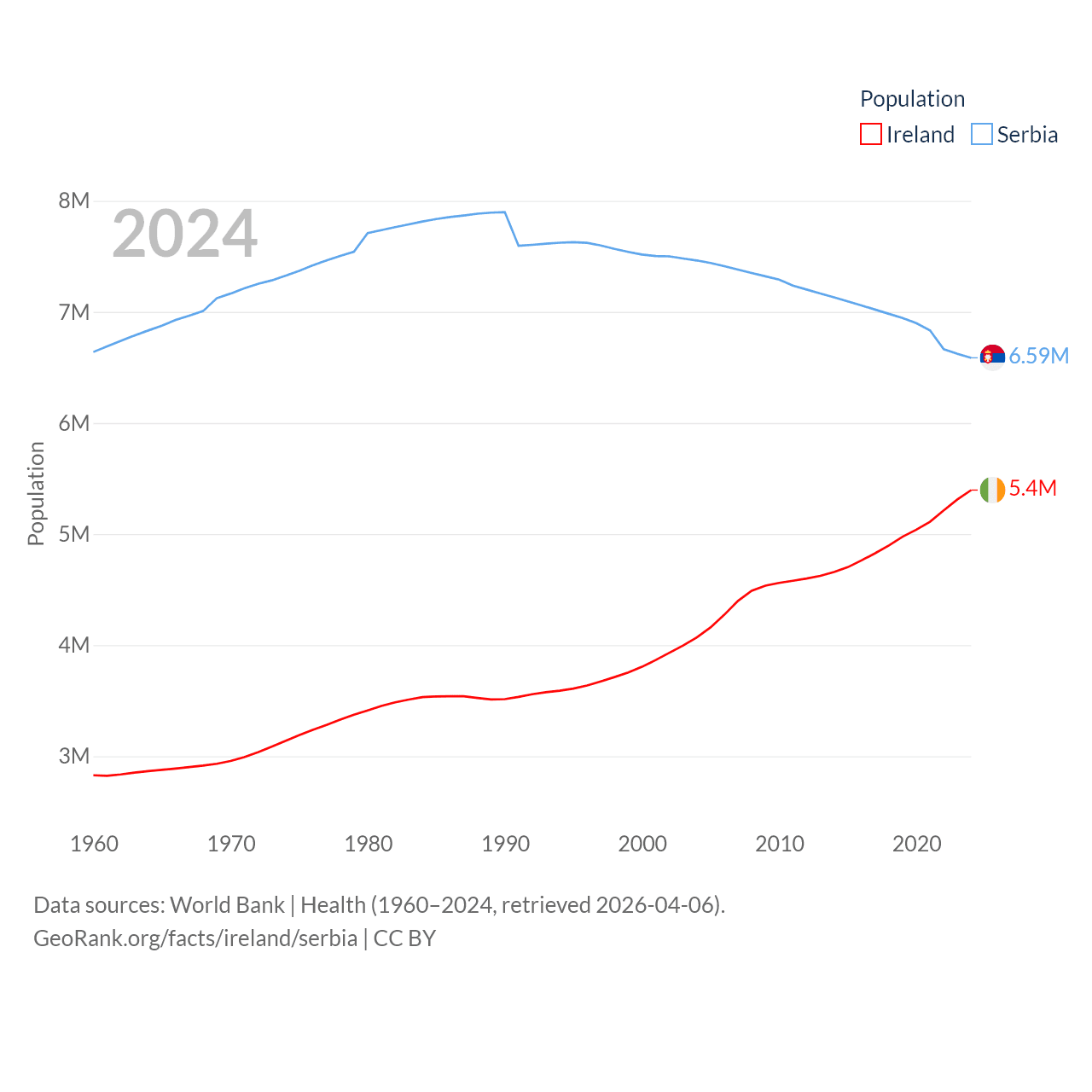 Ireland has a population of 5.4M (ranked 120/197), compared with 6.59M in Serbia (ranked 109/197). Ireland's land area is 26,599 sq mi versus 32,467 sq mi for Serbia (ranked 119th vs. 111th).