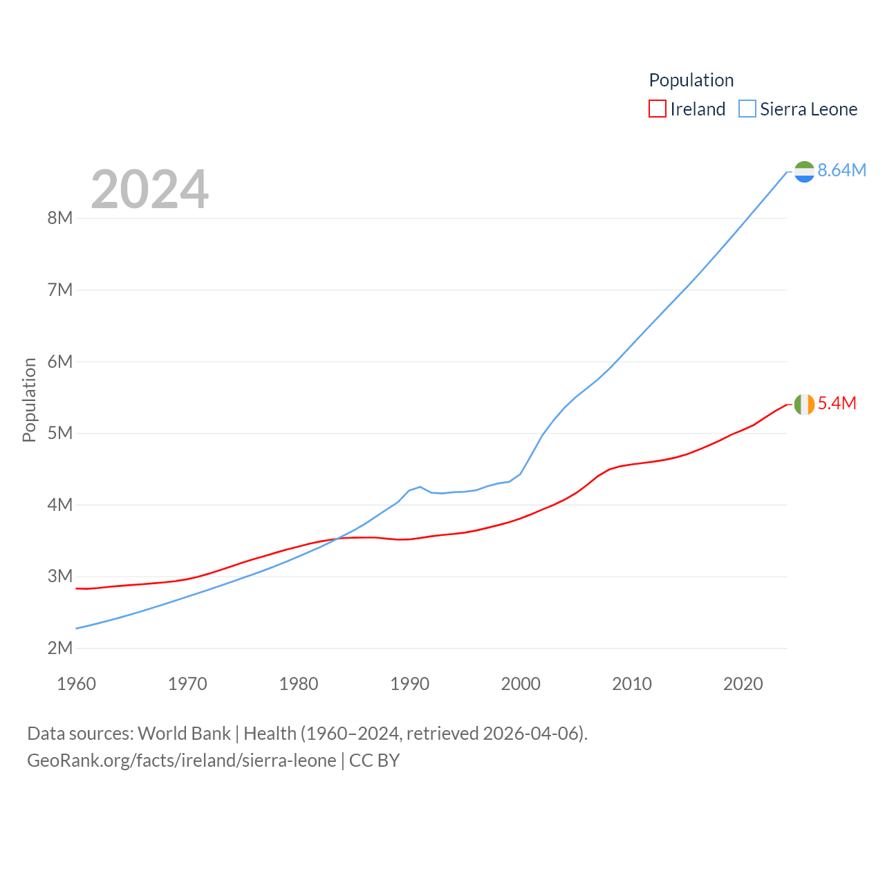 Ireland has a population of 5.4M (ranked 120/197), compared with 8.64M in Sierra Leone (ranked 102/197). Ireland's land area is 26,599 sq mi versus 27,869 sq mi for Sierra Leone (ranked 119th vs. 116th).