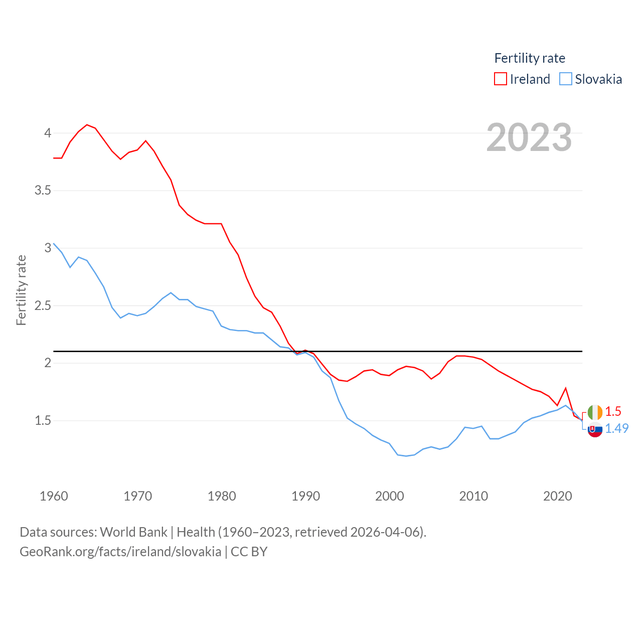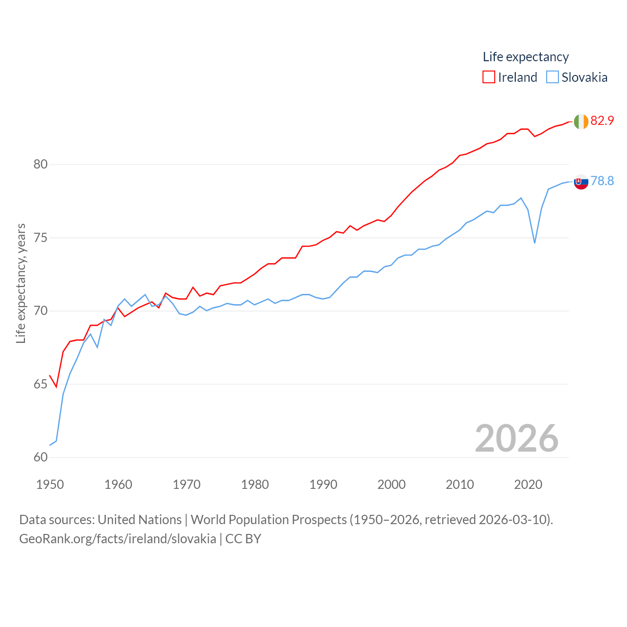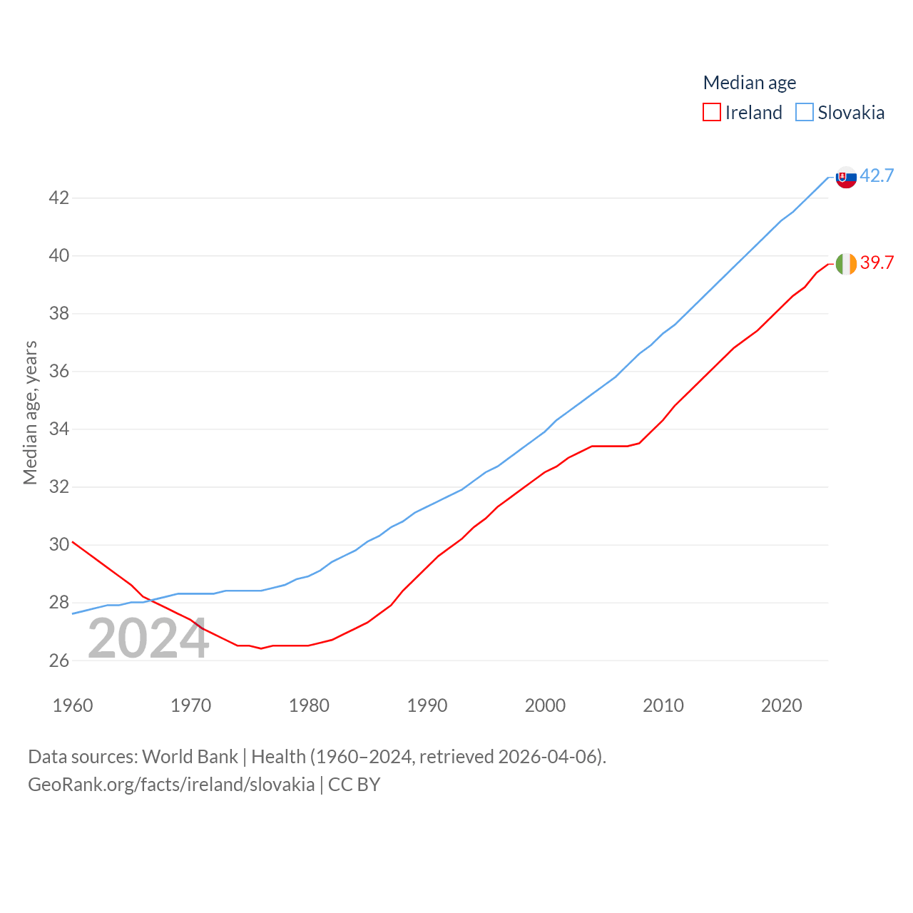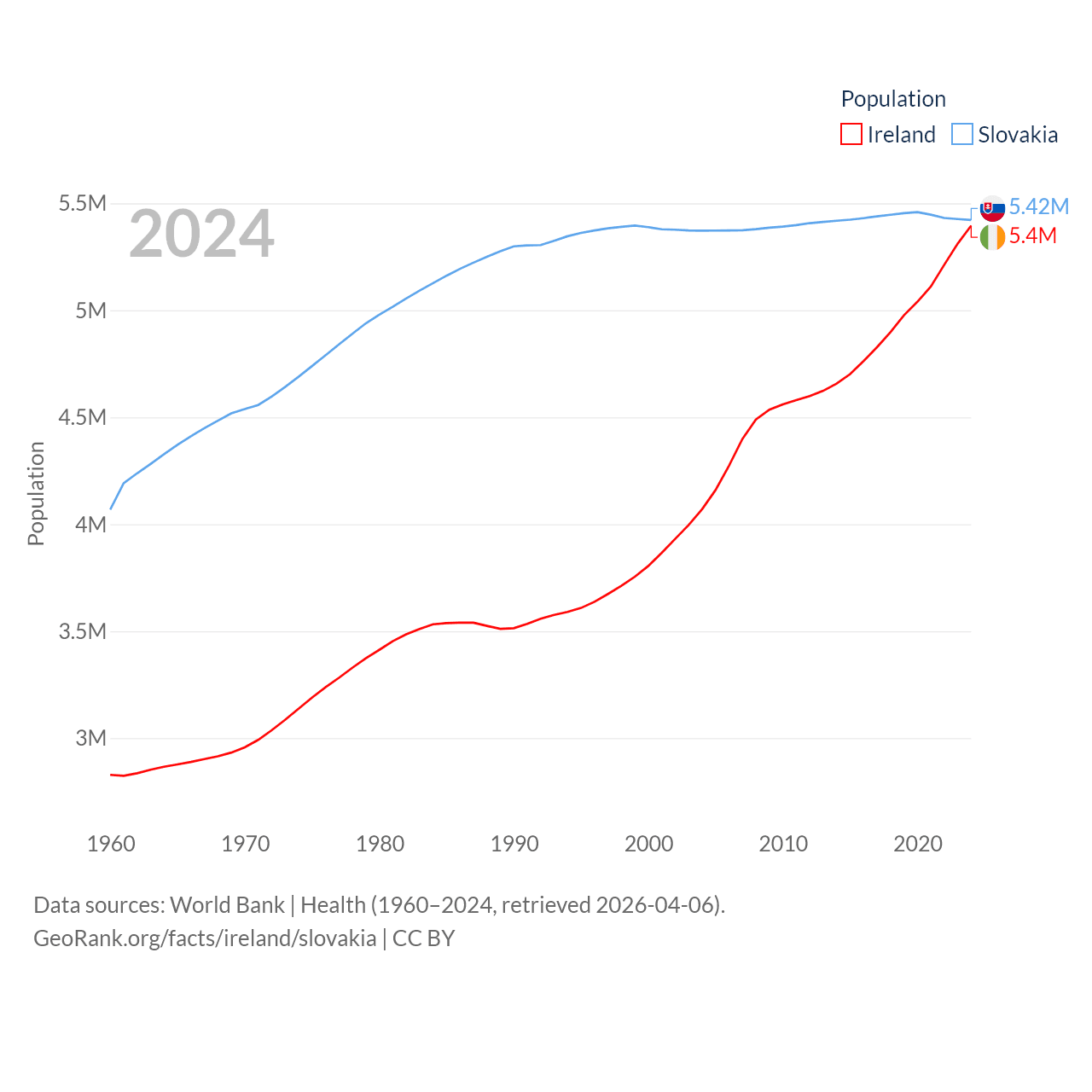 Ireland has a population of 5.4M (ranked 120/197), compared with 5.42M in Slovakia (ranked 119/197). Ireland's land area is 26,599 sq mi versus 18,564 sq mi for Slovakia (ranked 119th vs. 128th).