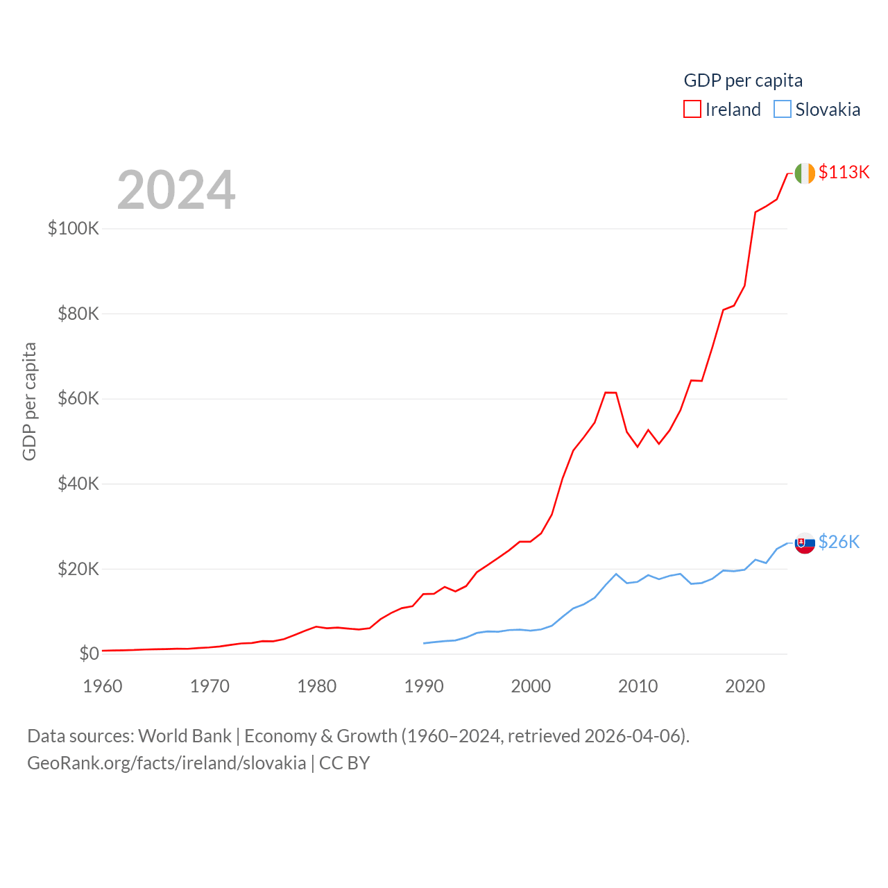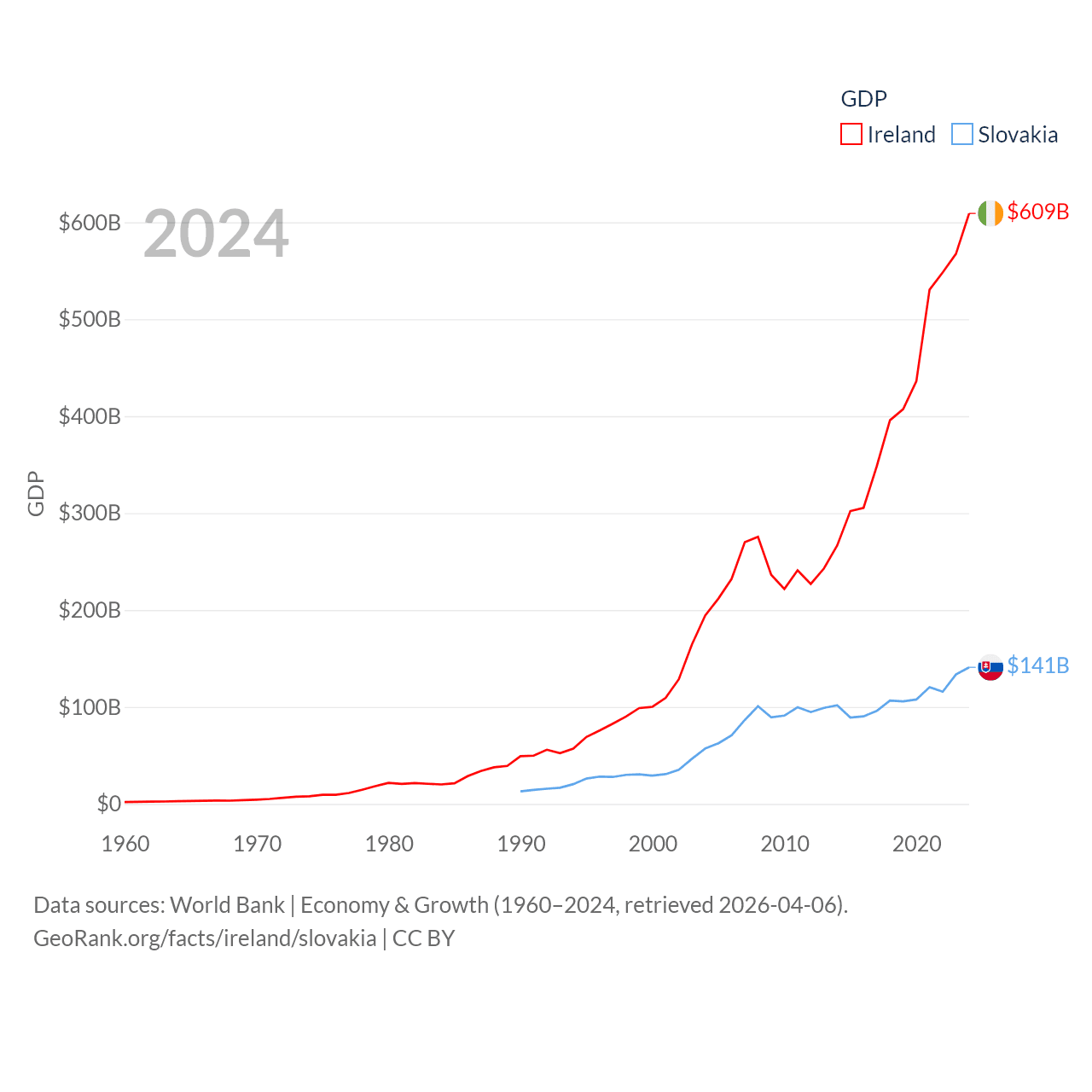 By GDP, Ireland ranks 25/197 ($609B) and Slovakia ranks 61/197 ($141B). By GDP per capita, Ireland ranks 4/197 ($112,895), while Slovakia ranks 47/197 ($25,993).
