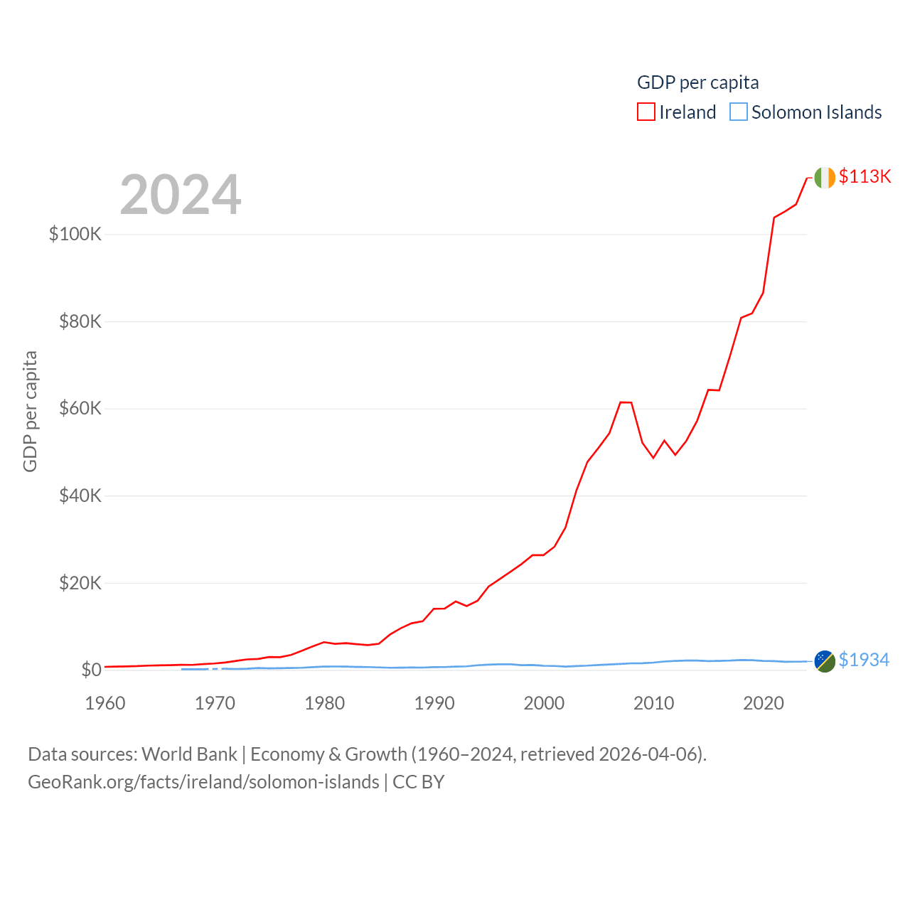 By GDP, Ireland ranks 25/197 ($609B) and The Solomon Islands ranks 182/197 ($1.58B). By GDP per capita, Ireland ranks 4/197 ($112,895), while The Solomon Islands ranks 157/197 ($1,934).