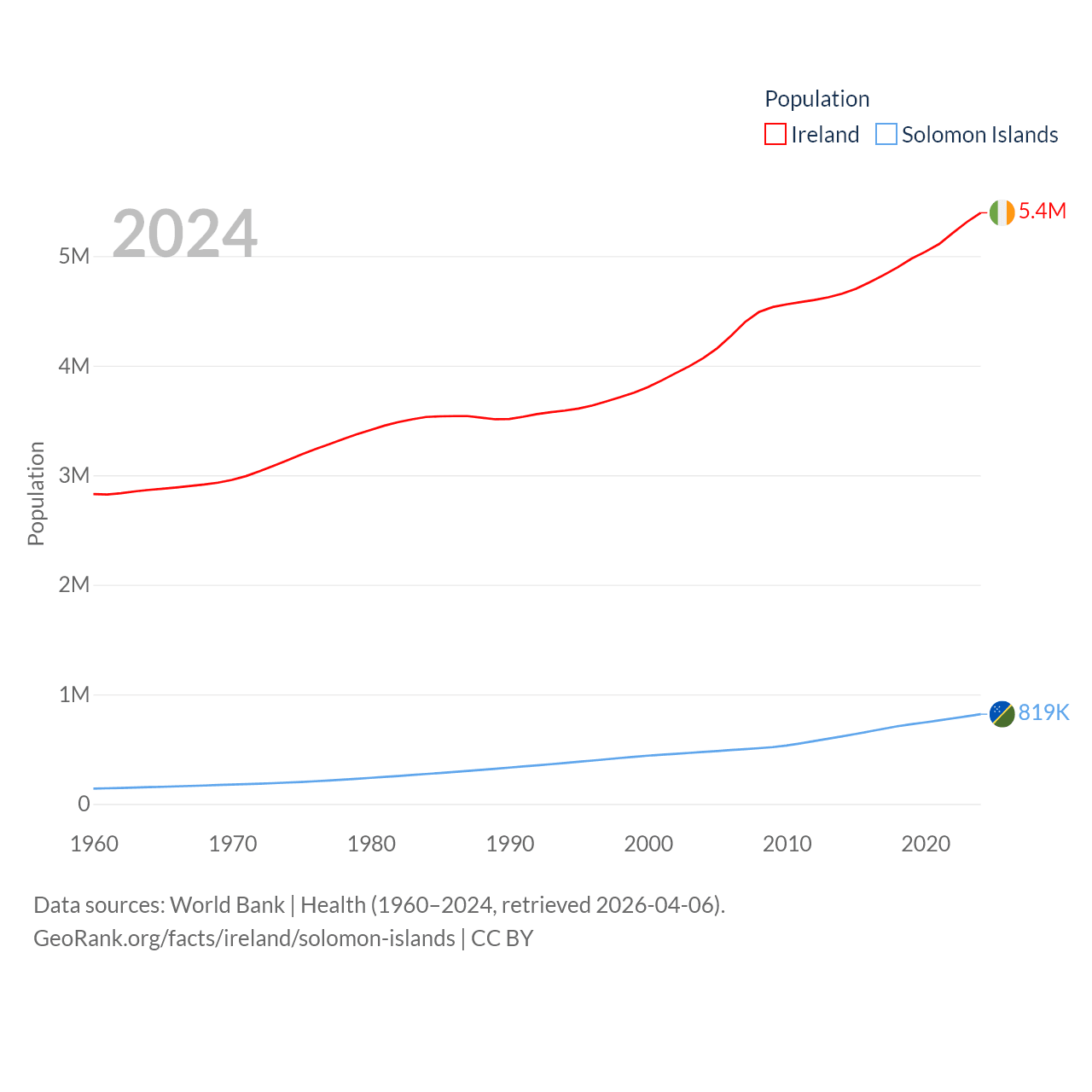 Ireland has a population of 5.4M (ranked 120/197), compared with 819K in The Solomon Islands (ranked 162/197). Ireland's land area is 26,599 sq mi versus 10,807 sq mi for The Solomon Islands (ranked 119th vs. 141st).