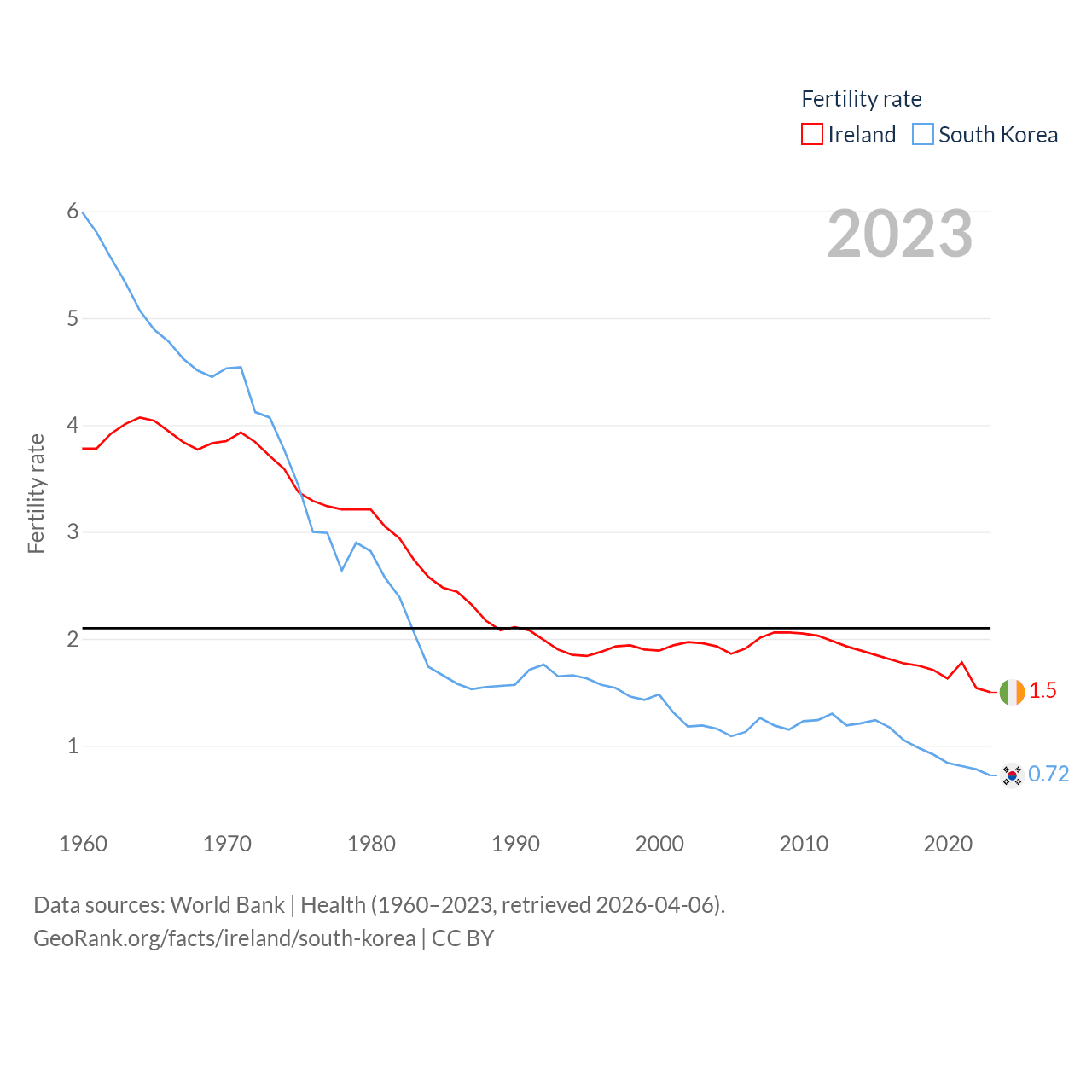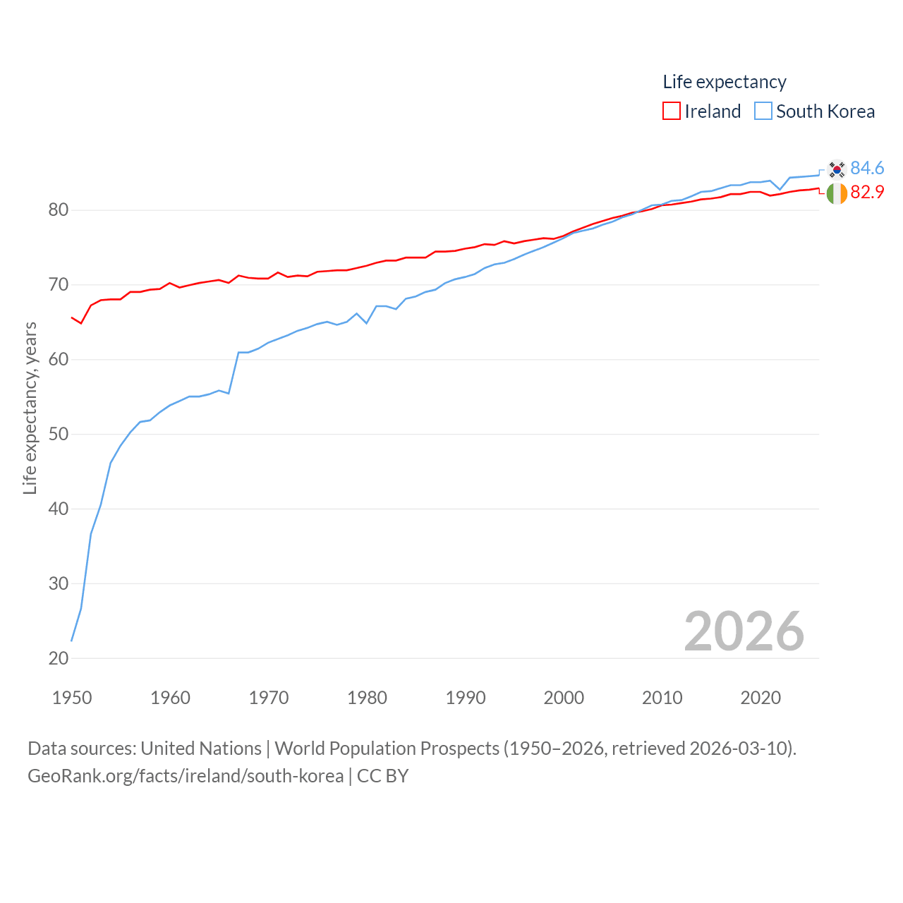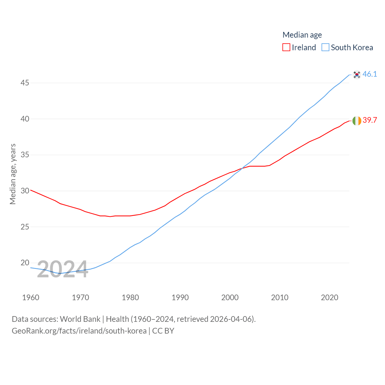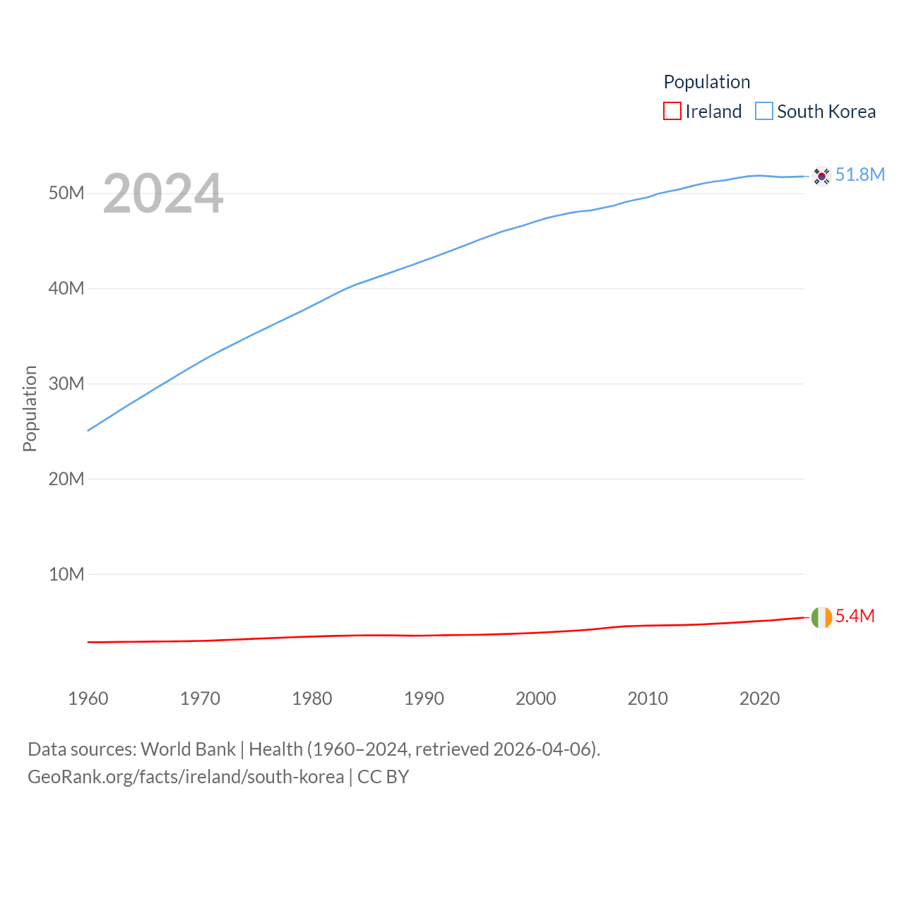 Ireland has a population of 5.4M (ranked 120/197), compared with 51.8M in South Korea (ranked 29/197). Ireland's land area is 26,599 sq mi versus 37,684 sq mi for South Korea (ranked 119th vs. 105th).