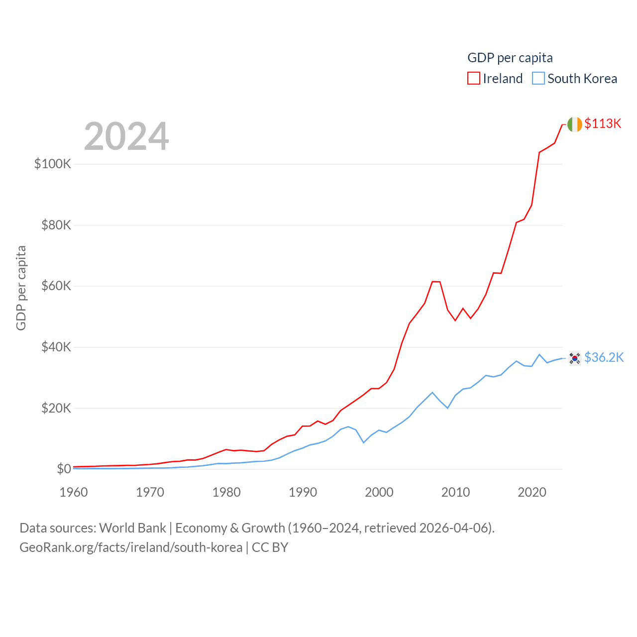 By GDP, Ireland ranks 25/197 ($609B) and South Korea ranks 12/197 ($1.88T). By GDP per capita, Ireland ranks 4/197 ($112,895), while South Korea ranks 31/197 ($36,239).