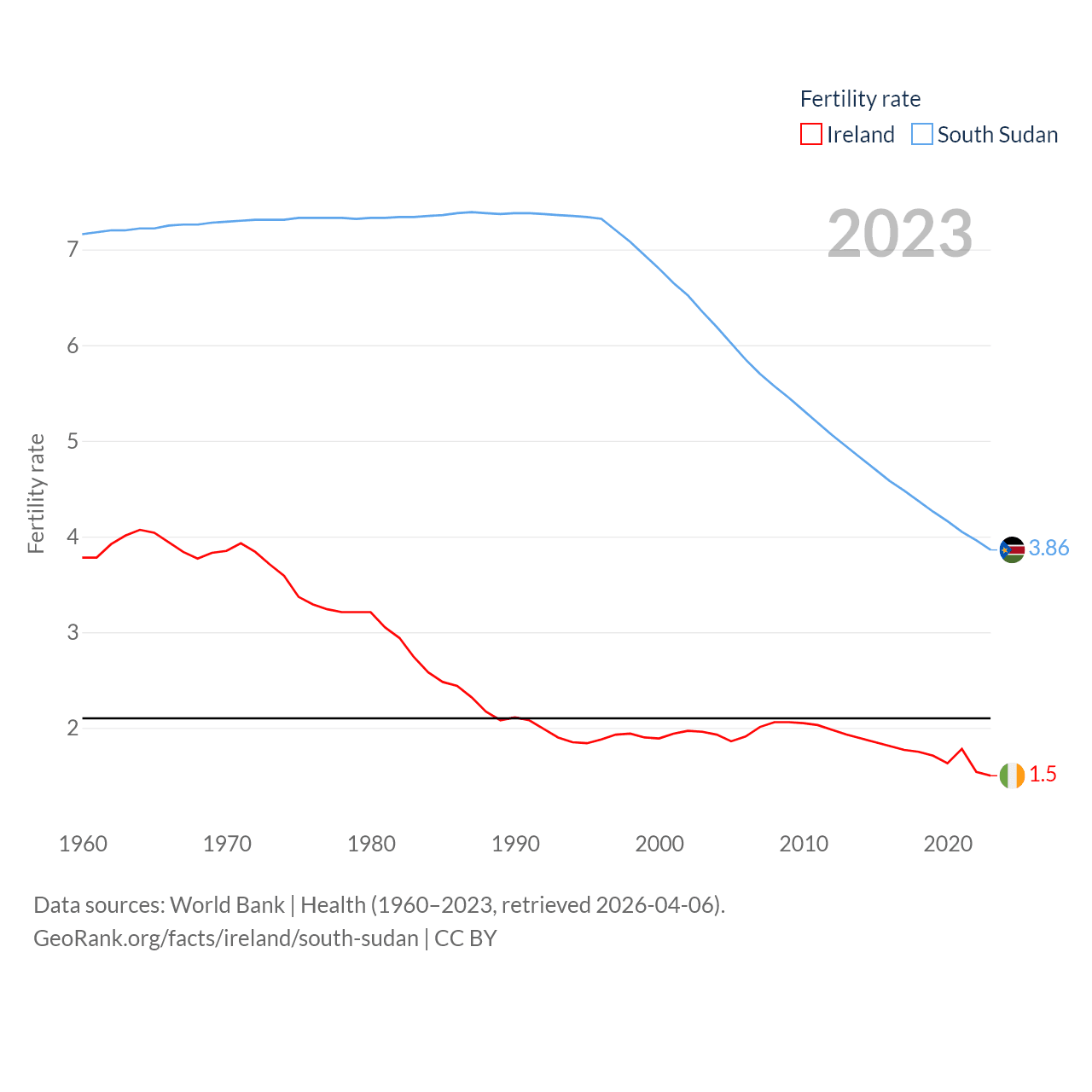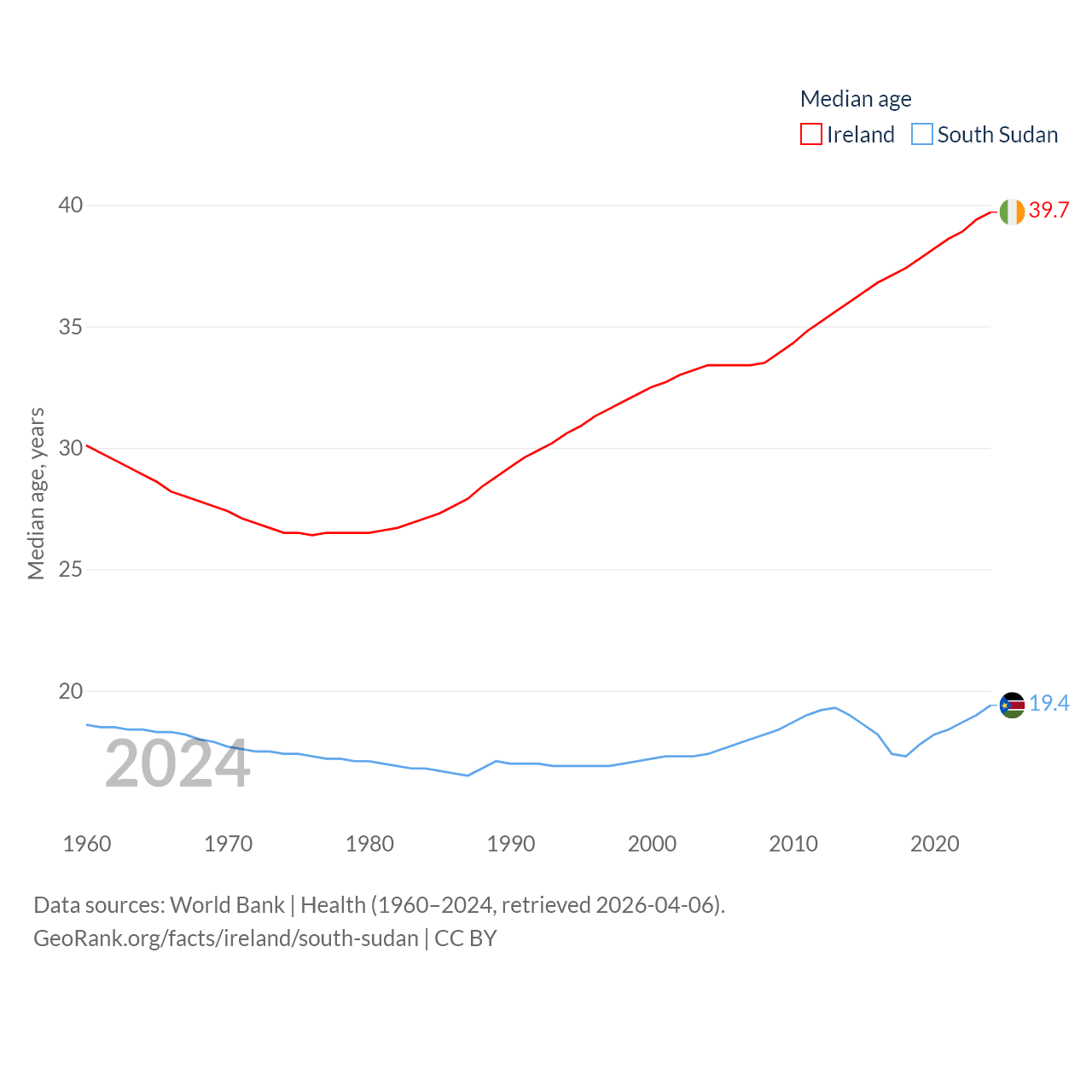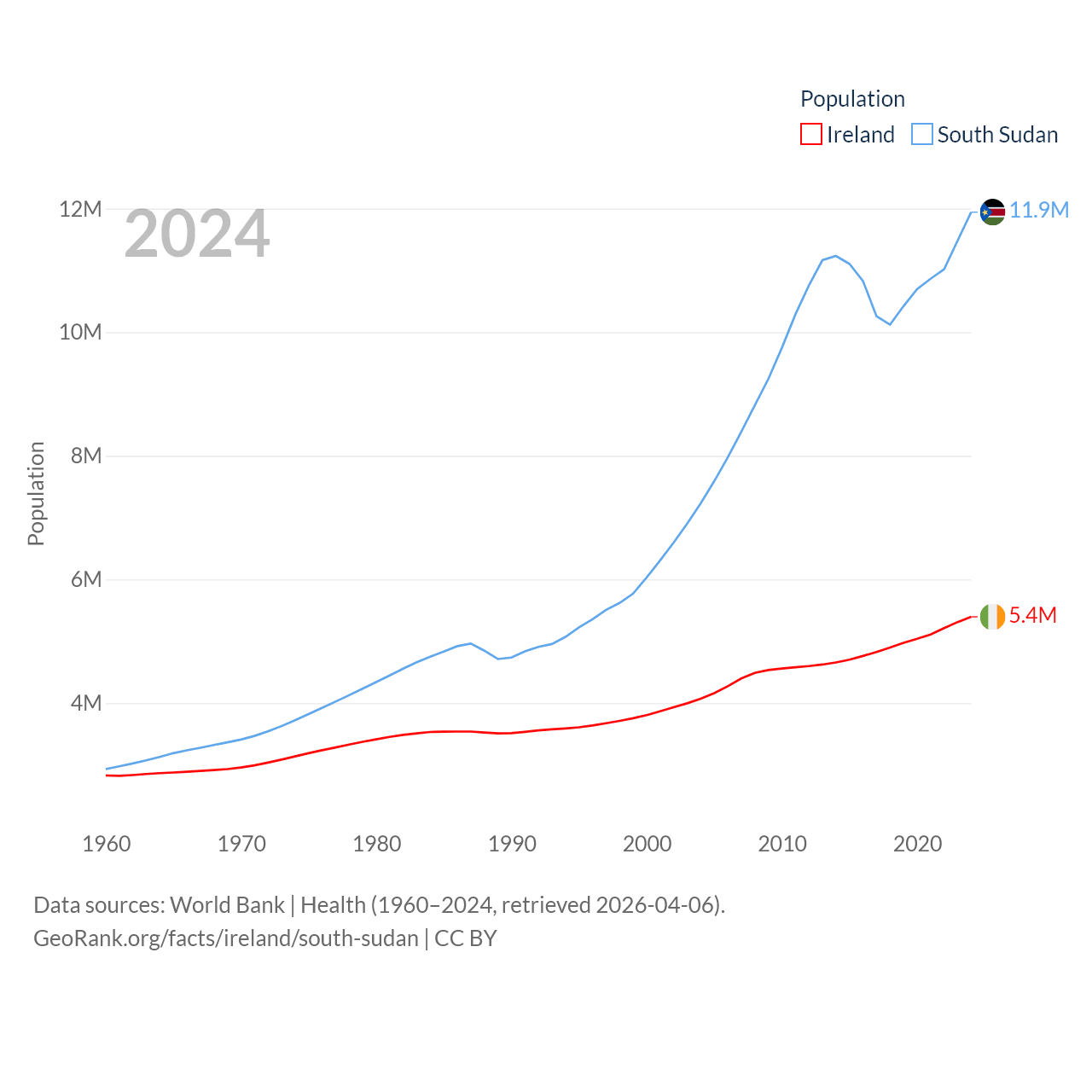 Ireland has a population of 5.4M (ranked 120/197), compared with 11.9M in South Sudan (ranked 81/197). Ireland's land area is 26,599 sq mi versus 243,990 sq mi for South Sudan (ranked 119th vs. 41st).