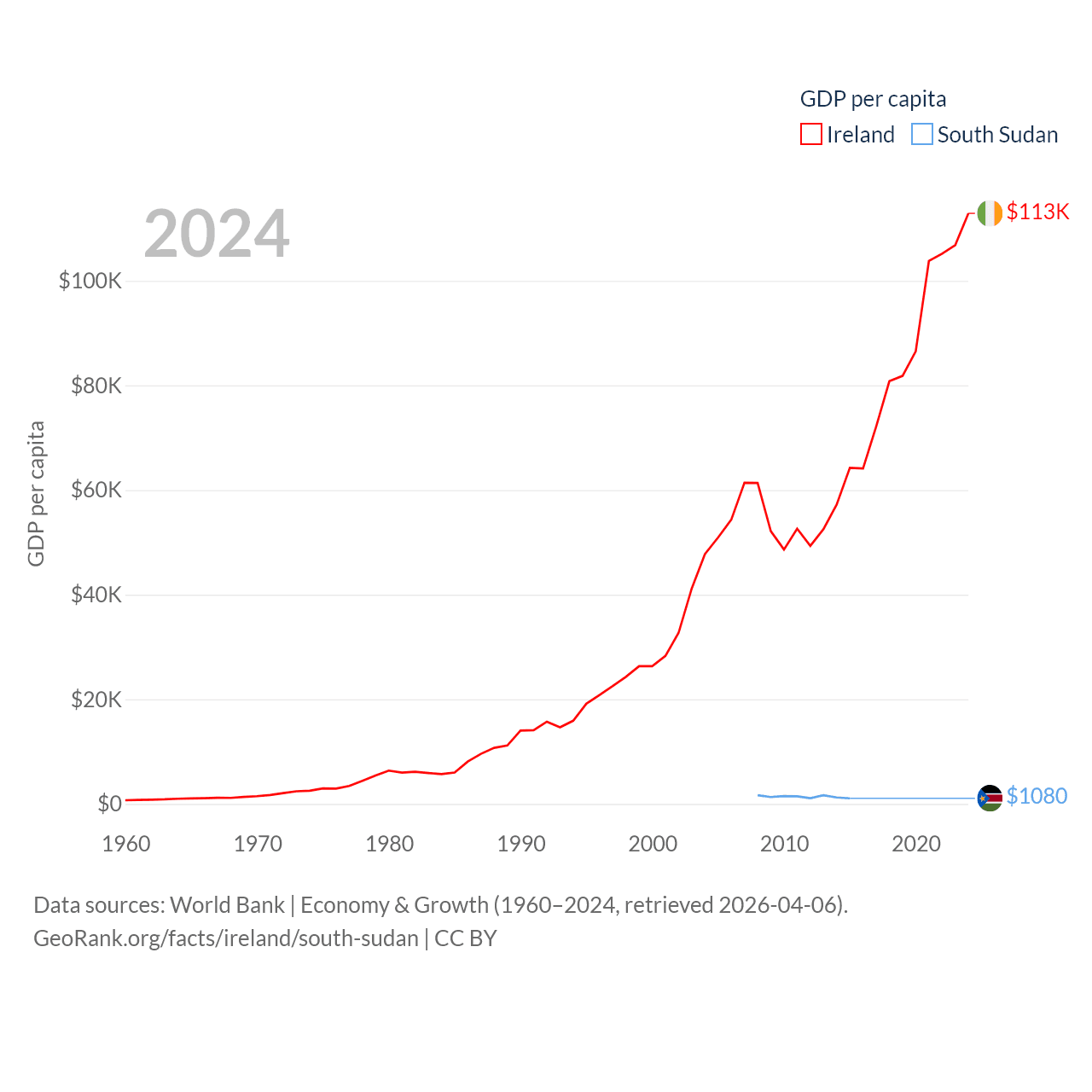 By GDP, Ireland ranks 25/197 ($609B) and South Sudan ranks 149/197 ($12B). By GDP per capita, Ireland ranks 4/197 ($112,895), while South Sudan ranks 175/197 ($1,080).
