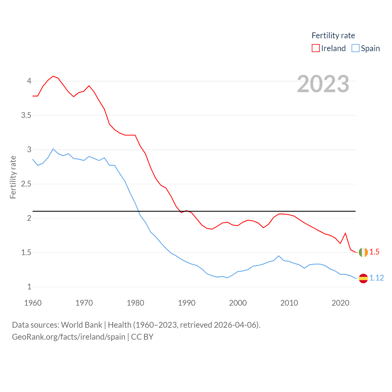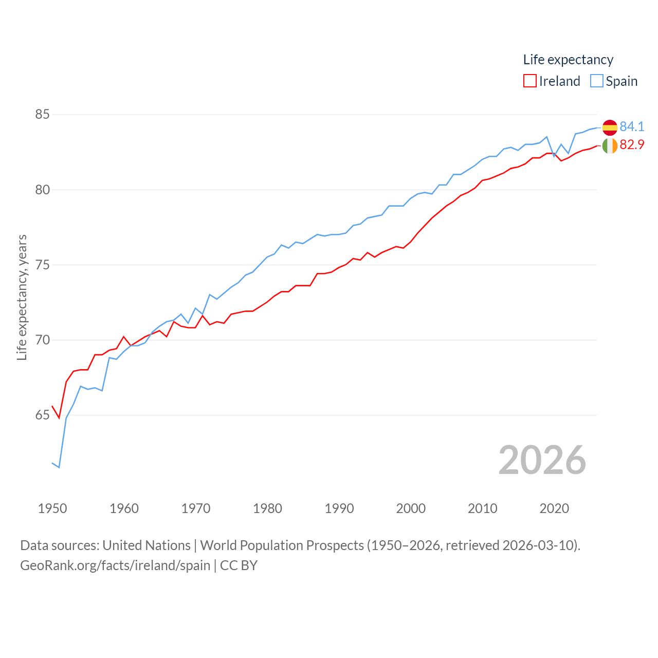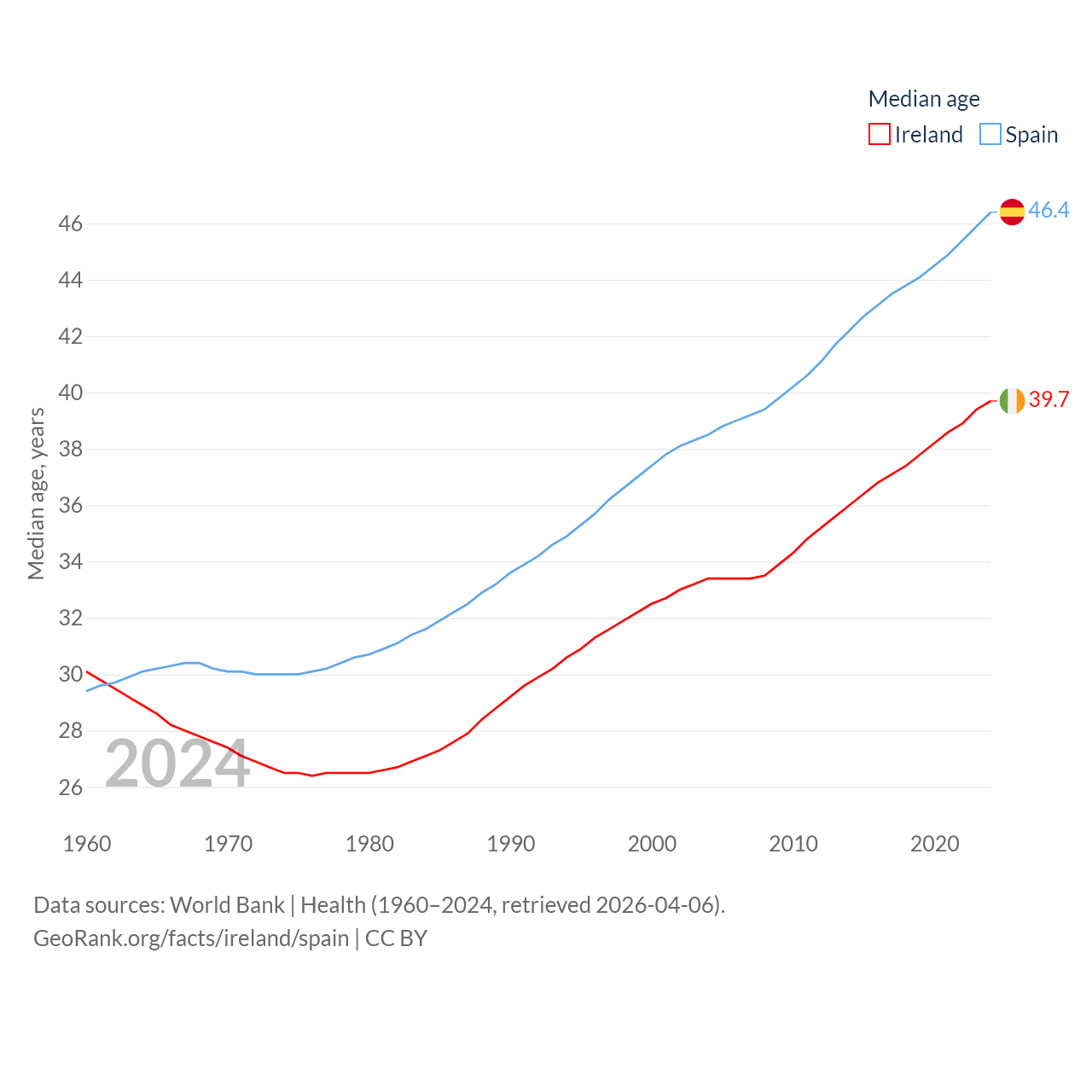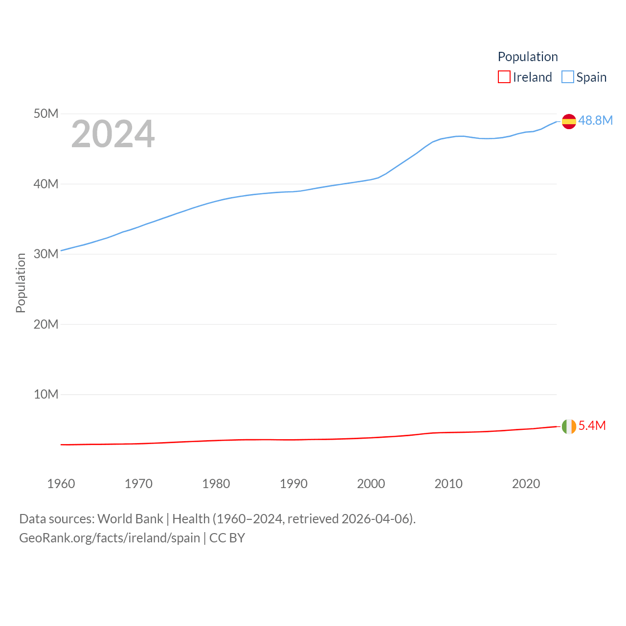 Ireland has a population of 5.4M (ranked 120/197), compared with 48.8M in Spain (ranked 32/197). Ireland's land area is 26,599 sq mi versus 192,934 sq mi for Spain (ranked 119th vs. 51st).