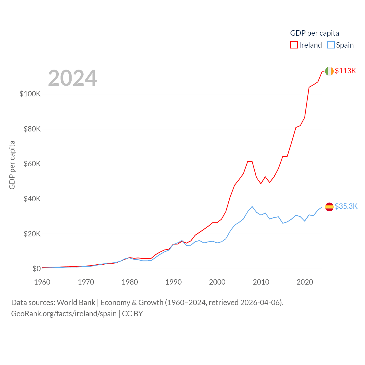 By GDP, Ireland ranks 25/197 ($609B) and Spain ranks 15/197 ($1.73T). By GDP per capita, Ireland ranks 4/197 ($112,895), while Spain ranks 32/197 ($35,327).