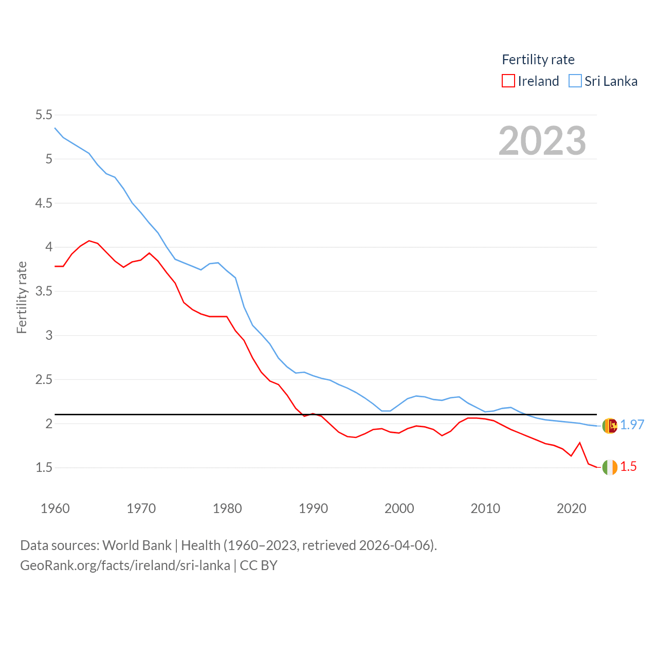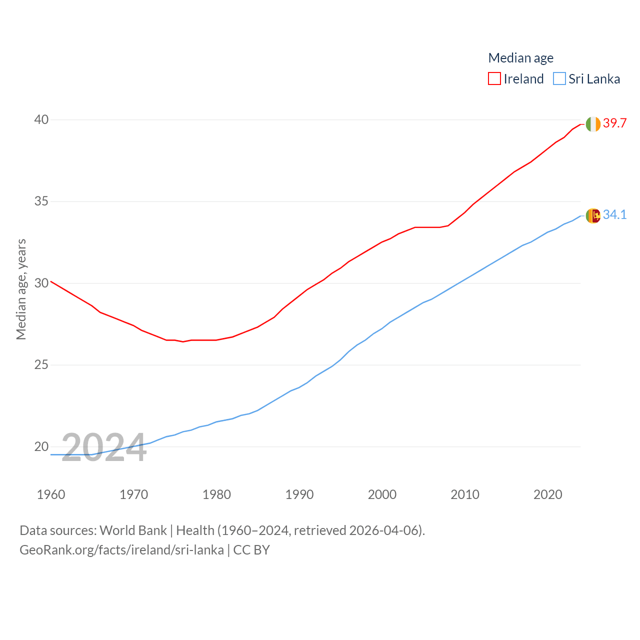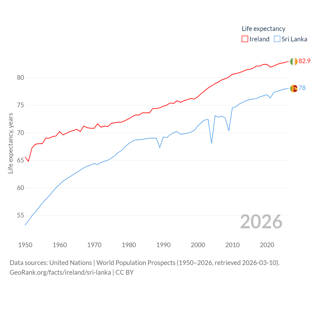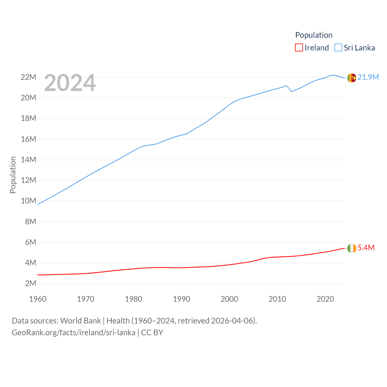 Ireland has a population of 5.4M (ranked 120/197), compared with 21.9M in Sri Lanka (ranked 61/197). Ireland's land area is 26,599 sq mi versus 23,884 sq mi for Sri Lanka (ranked 119th vs. 122nd).
