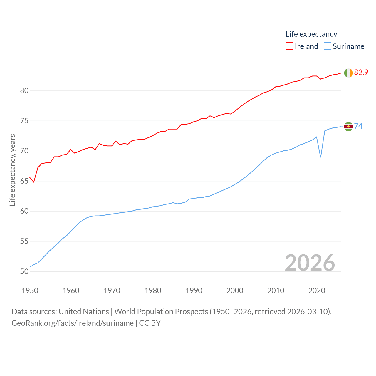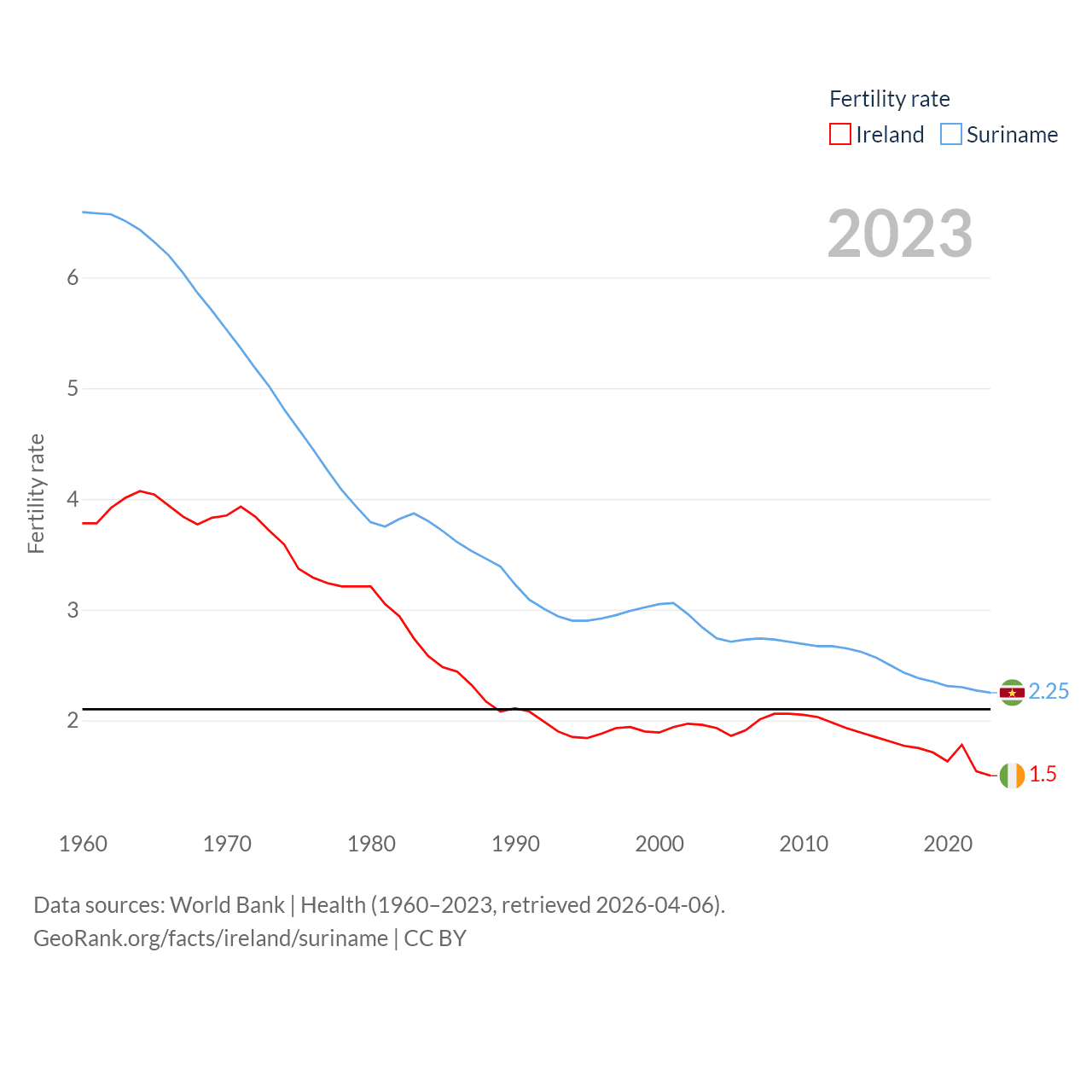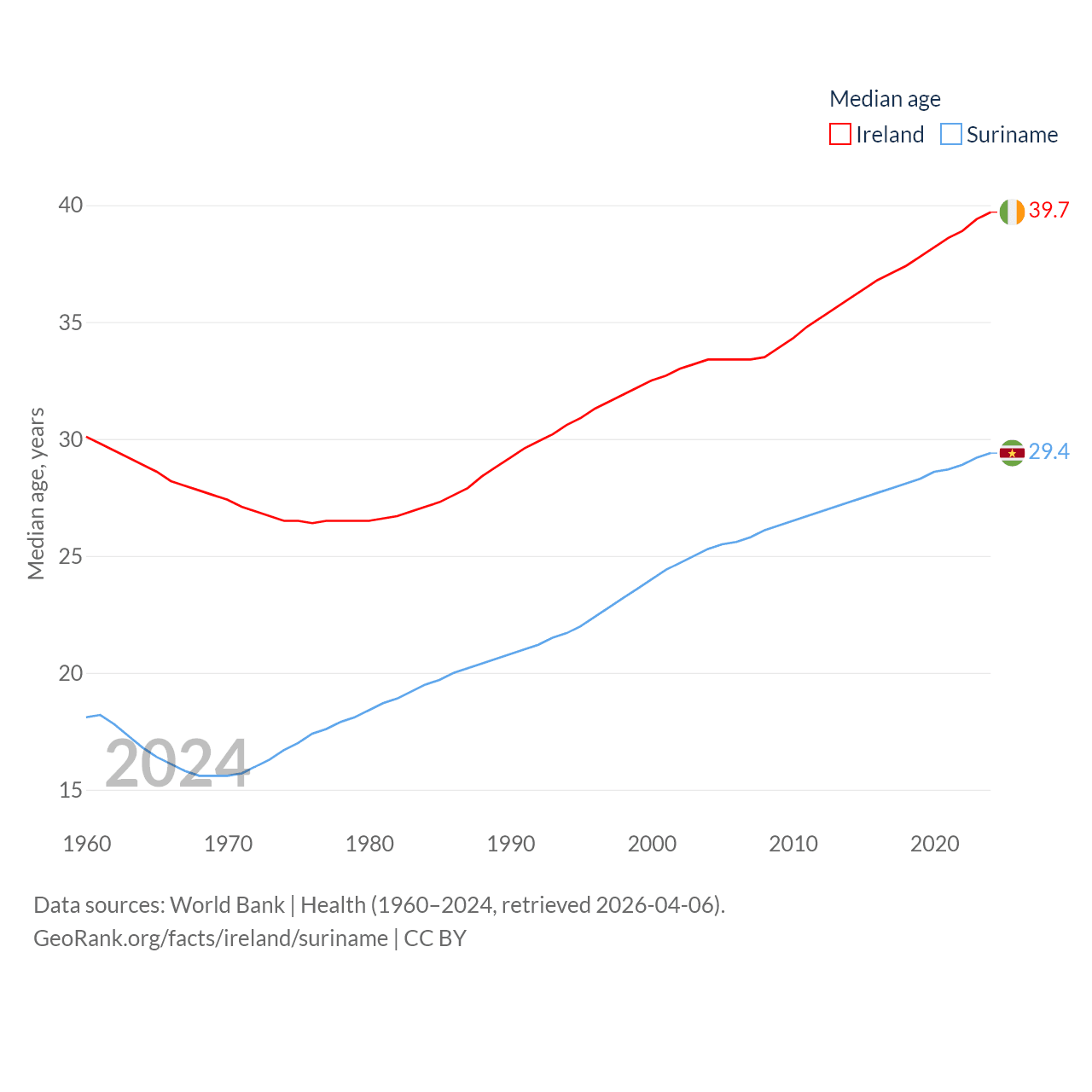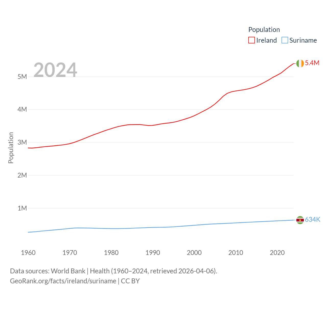 Ireland has a population of 5.4M (ranked 120/197), compared with 634K in Suriname (ranked 165/197). Ireland's land area is 26,599 sq mi versus 61,972 sq mi for Suriname (ranked 119th vs. 90th).