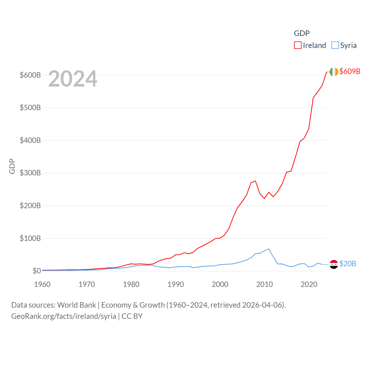By GDP, Ireland ranks 25/197 ($609B) and Syria ranks 129/197 ($20B). By GDP per capita, Ireland ranks 4/197 ($112,895), while Syria ranks 185/197 ($847).