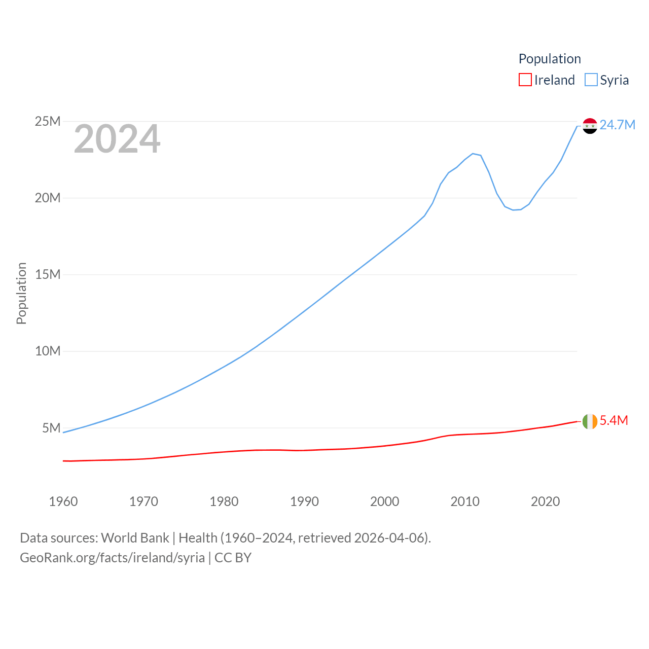 Ireland has a population of 5.4M (ranked 120/197), compared with 24.7M in Syria (ranked 57/197). Ireland's land area is 26,599 sq mi versus 70,900 sq mi for Syria (ranked 119th vs. 87th).