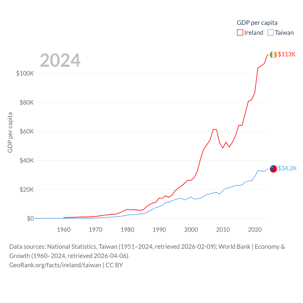 By GDP, Ireland ranks 25/197 ($609B) and Taiwan ranks 22/197 ($802B). By GDP per capita, Ireland ranks 4/197 ($112,895), while Taiwan ranks 35/197 ($34,238).
