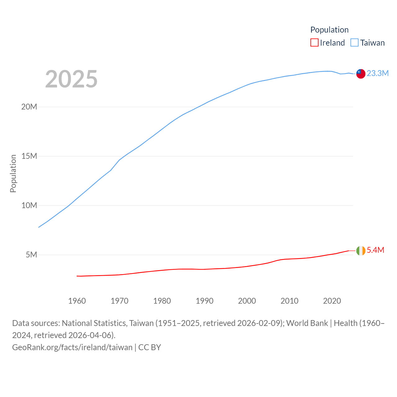 Ireland has a population of 5.4M (ranked 120/197), compared with 23.3M in Taiwan (ranked 60/197). Ireland's land area is 26,599 sq mi versus 13,976 sq mi for Taiwan (ranked 119th vs. 133rd).