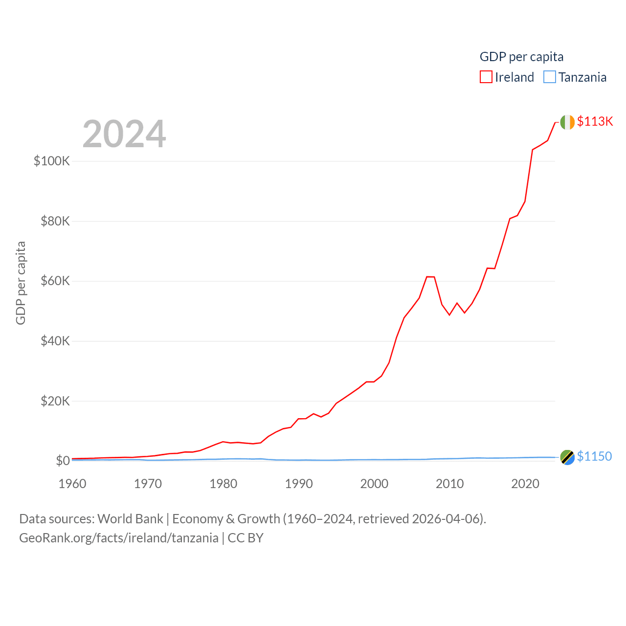 By GDP, Ireland ranks 25/197 ($609B) and Tanzania ranks 82/197 ($78.8B). By GDP per capita, Ireland ranks 4/197 ($112,895), while Tanzania ranks 170/197 ($1,150).