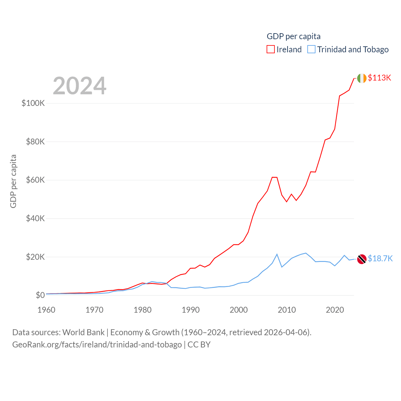 By GDP, Ireland ranks 25/197 ($609B) and Trinidad and Tobago ranks 115/197 ($25.6B). By GDP per capita, Ireland ranks 4/197 ($112,895), while Trinidad and Tobago ranks 61/197 ($18,733).