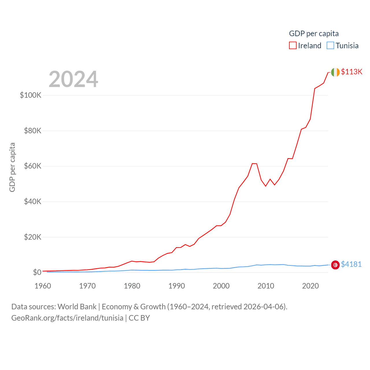 By GDP, Ireland ranks 25/197 ($609B) and Tunisia ranks 93/197 ($51.3B). By GDP per capita, Ireland ranks 4/197 ($112,895), while Tunisia ranks 129/197 ($4,181).