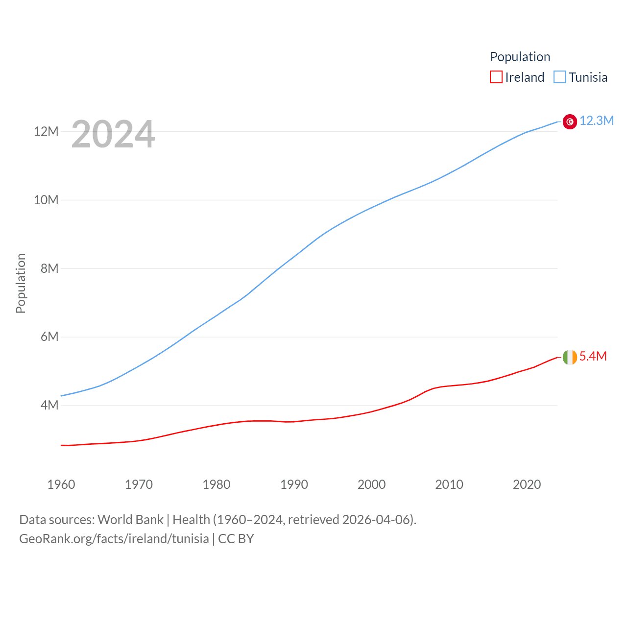 Ireland has a population of 5.4M (ranked 120/197), compared with 12.3M in Tunisia (ranked 80/197). Ireland's land area is 26,599 sq mi versus 59,985 sq mi for Tunisia (ranked 119th vs. 91st).