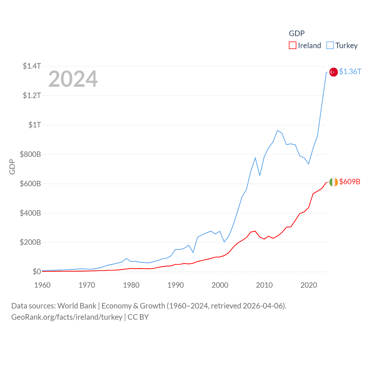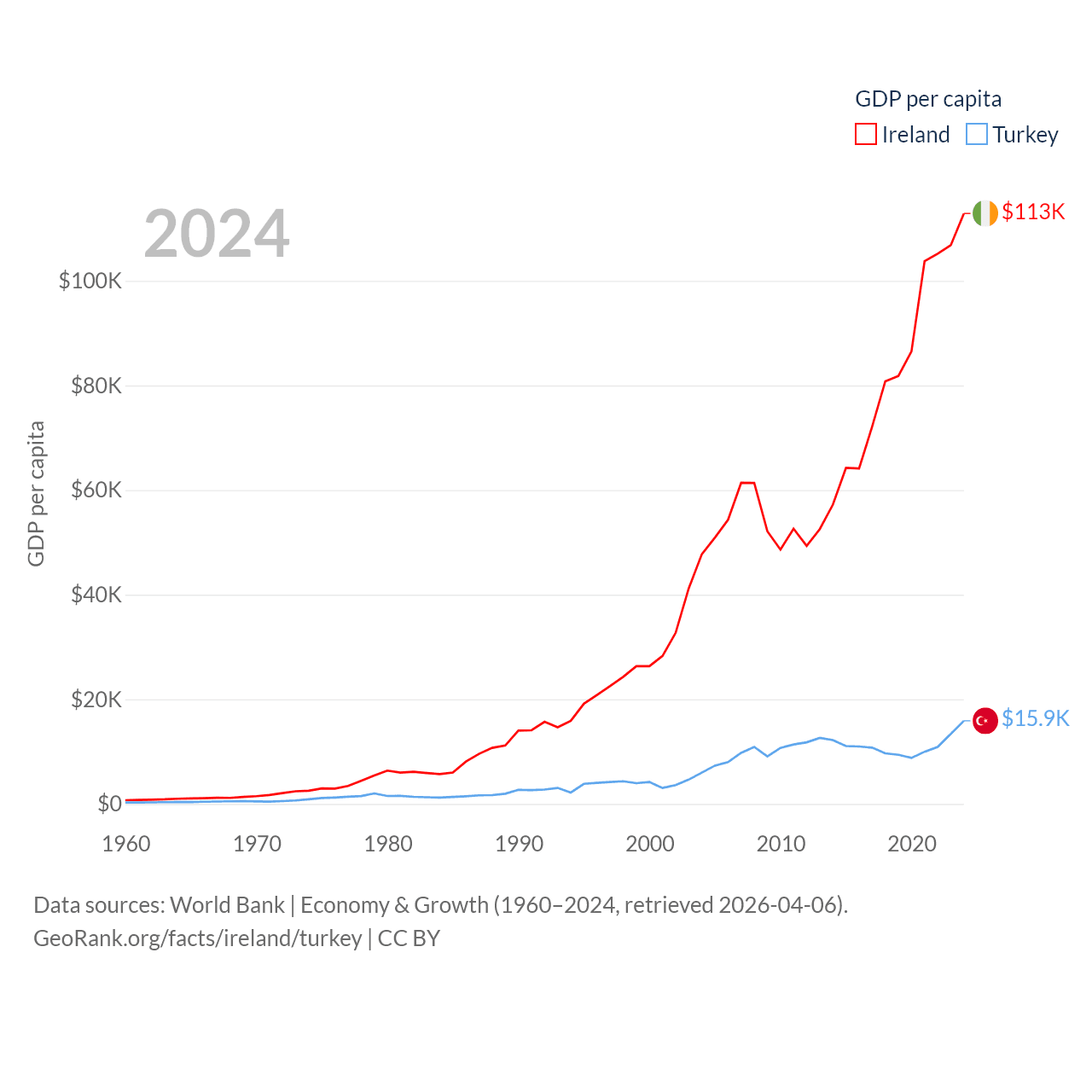 By GDP, Ireland ranks 25/197 ($609B) and Turkey ranks 17/197 ($1.36T). By GDP per capita, Ireland ranks 4/197 ($112,895), while Turkey ranks 66/197 ($15,893).