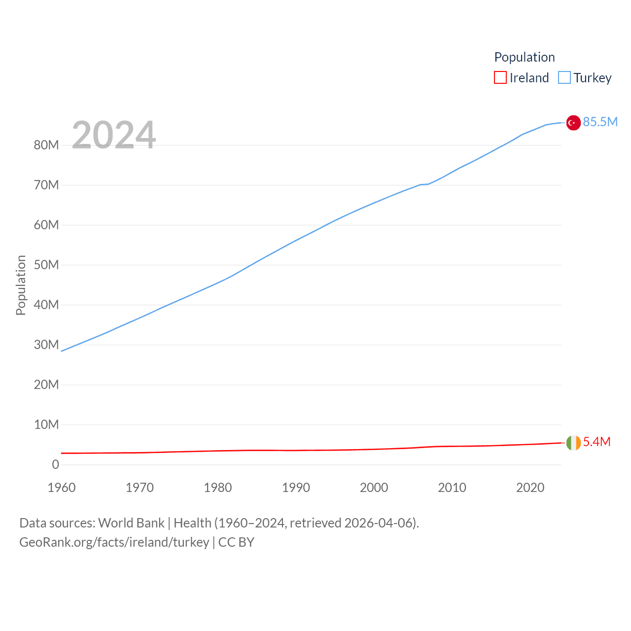Ireland has a population of 5.4M (ranked 120/197), compared with 85.5M in Turkey (ranked 18/197). Ireland's land area is 26,599 sq mi versus 297,156 sq mi for Turkey (ranked 119th vs. 36th).