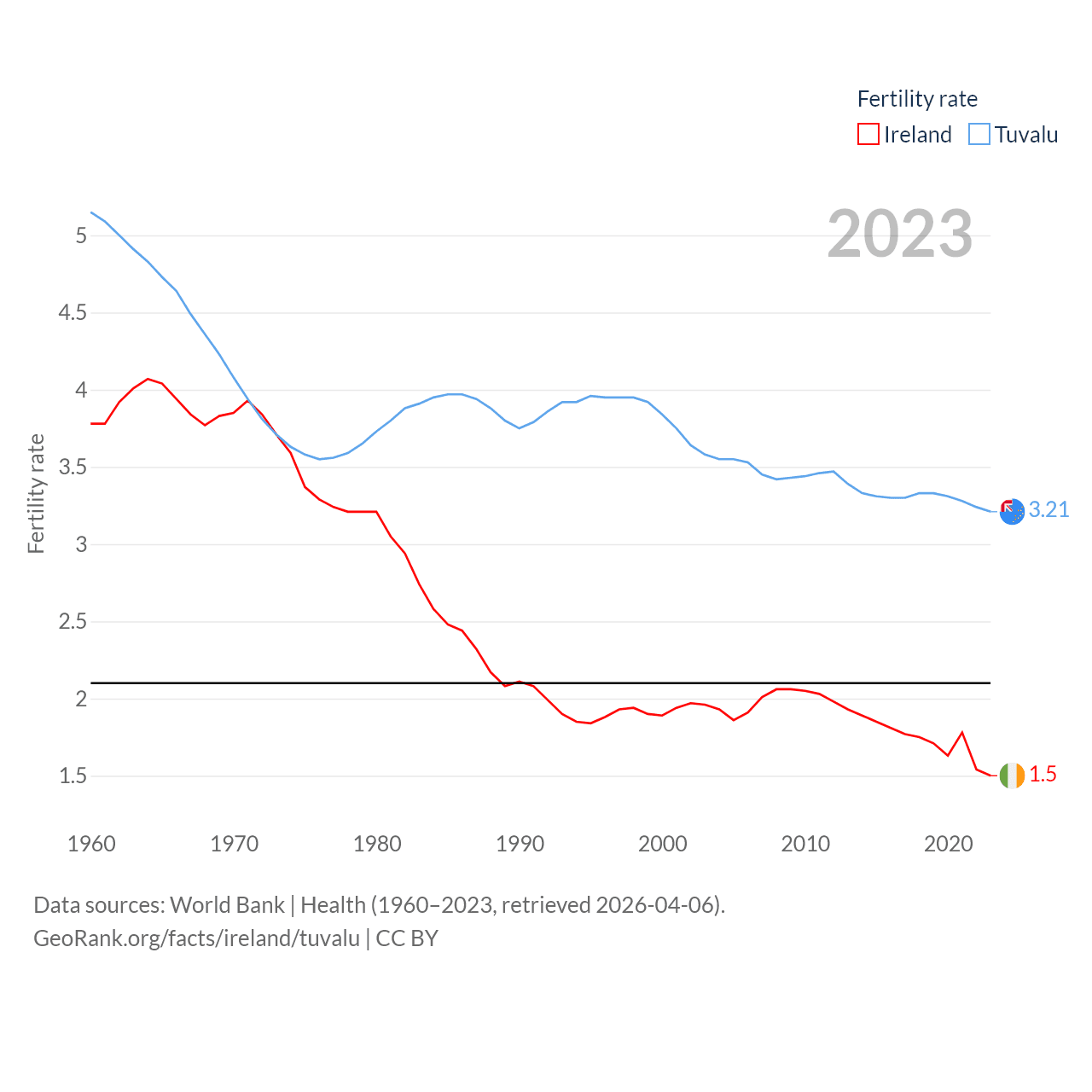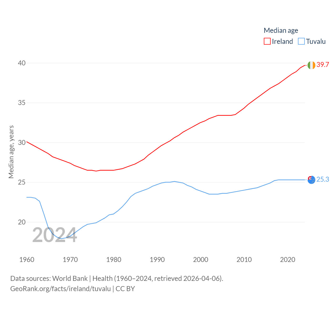 Ireland has a population of 5.4M (ranked 120/197), compared with 9.65K in Tuvalu (ranked 196/197). Ireland's land area is 26,599 sq mi versus 11.6 sq mi for Tuvalu (ranked 119th vs. 194th).