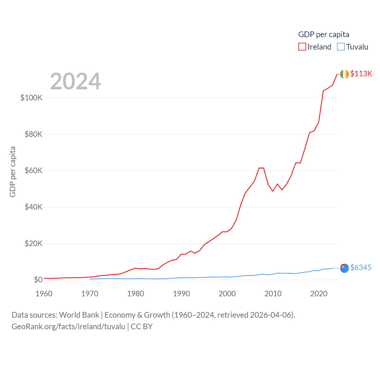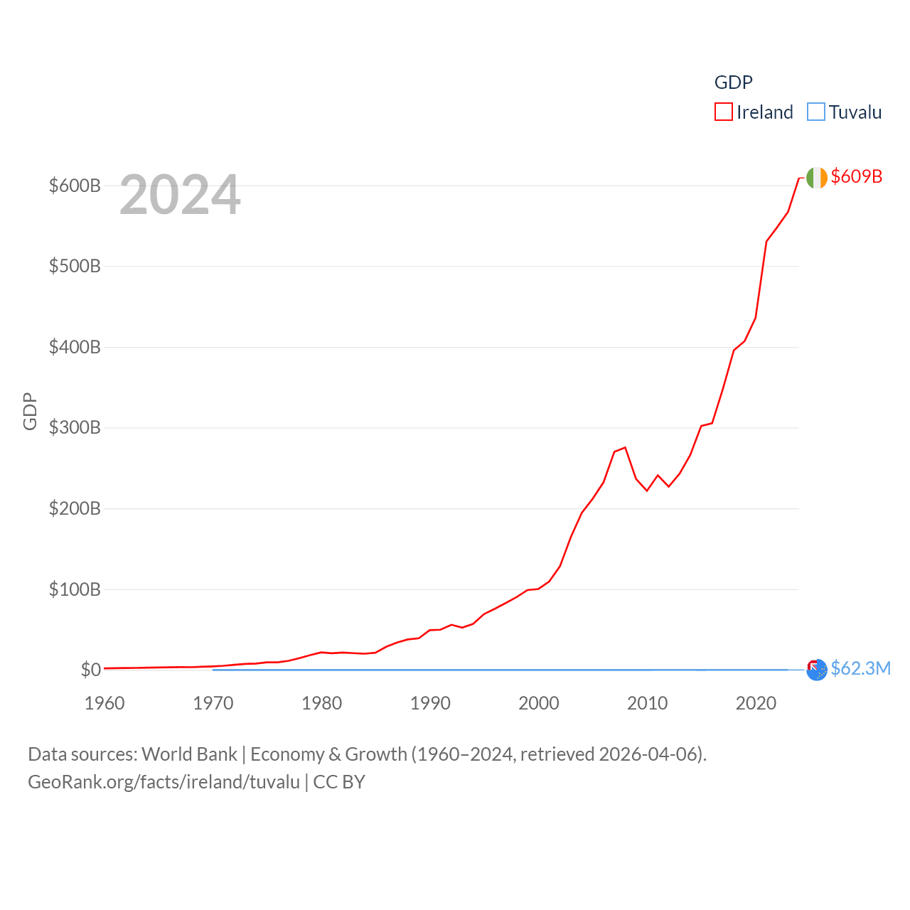 By GDP, Ireland ranks 25/197 ($609B) and Tuvalu ranks 196/197 ($62.3M). By GDP per capita, Ireland ranks 4/197 ($112,895), while Tuvalu ranks 110/197 ($6,345).
