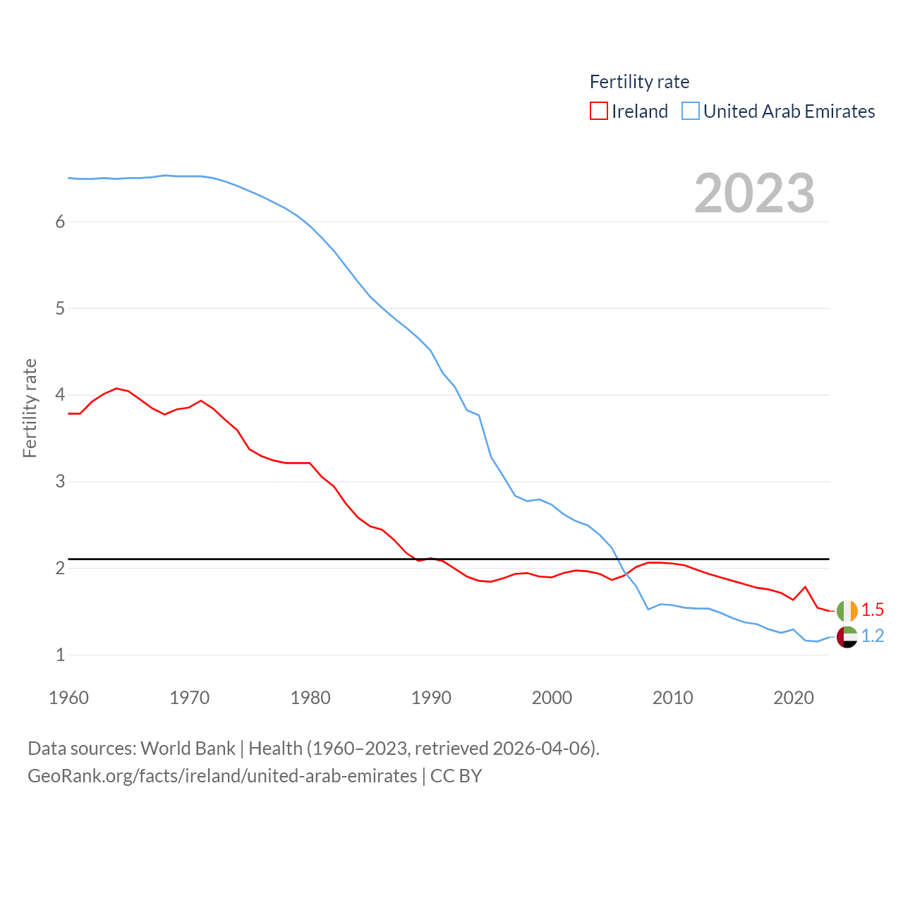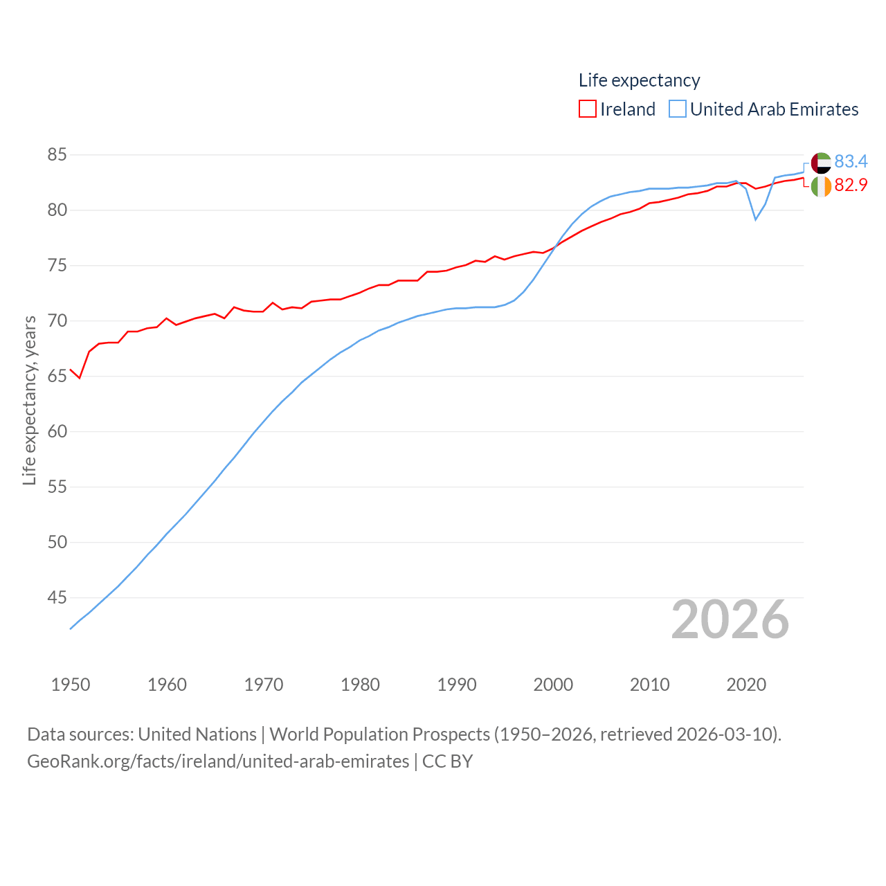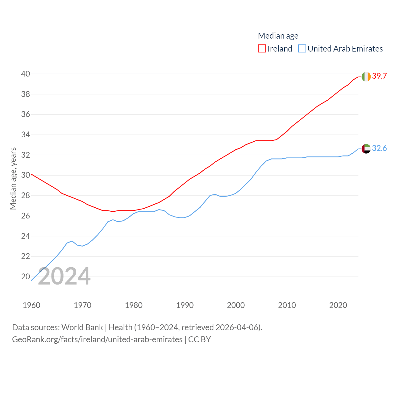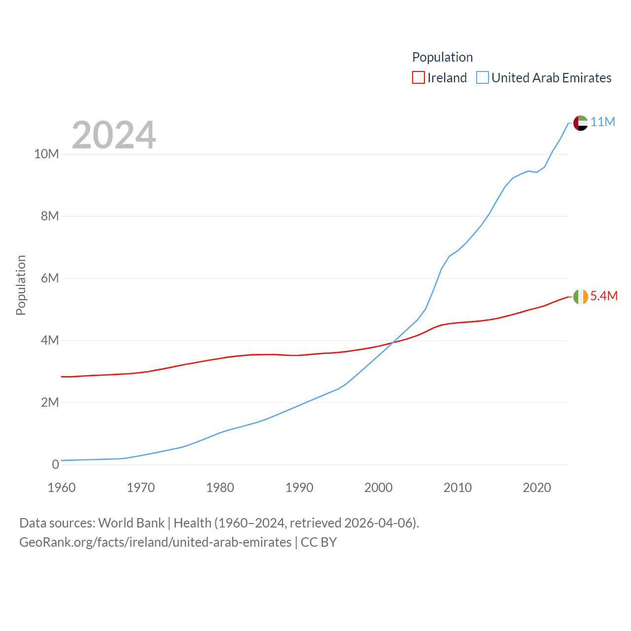 Ireland has a population of 5.4M (ranked 120/197), compared with 11M in The United Arab Emirates (ranked 86/197). Ireland's land area is 26,599 sq mi versus 27,421 sq mi for The United Arab Emirates (ranked 119th vs. 117th).