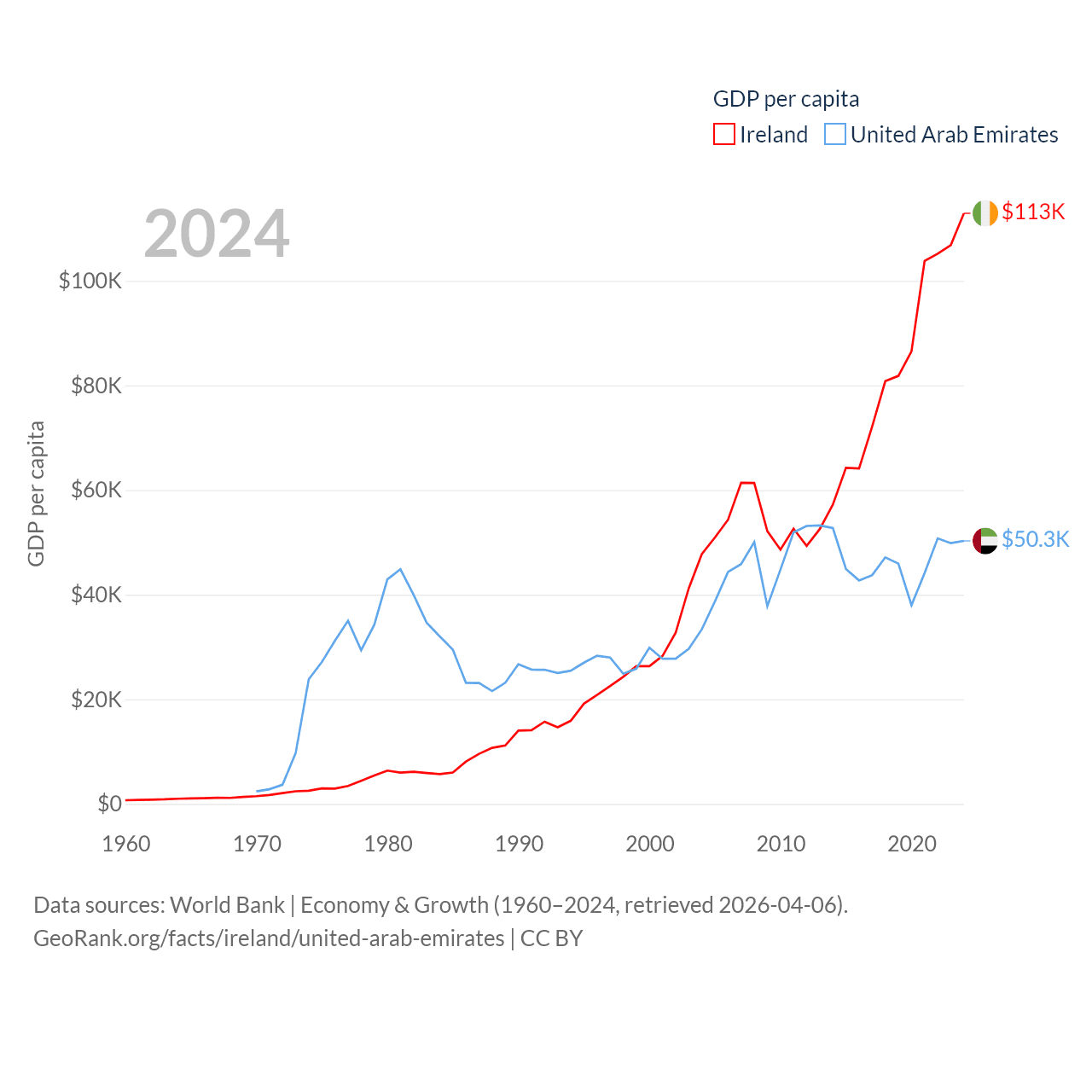 By GDP, Ireland ranks 25/197 ($609B) and The United Arab Emirates ranks 27/197 ($552B). By GDP per capita, Ireland ranks 4/197 ($112,895), while The United Arab Emirates ranks 24/197 ($50,274).