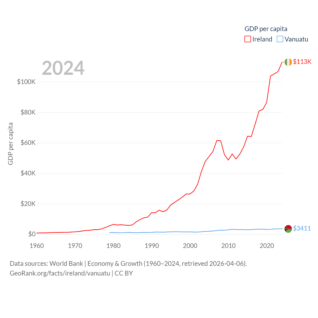 By GDP, Ireland ranks 25/197 ($609B) and Vanuatu ranks 188/197 ($1.12B). By GDP per capita, Ireland ranks 4/197 ($112,895), while Vanuatu ranks 137/197 ($3,411).